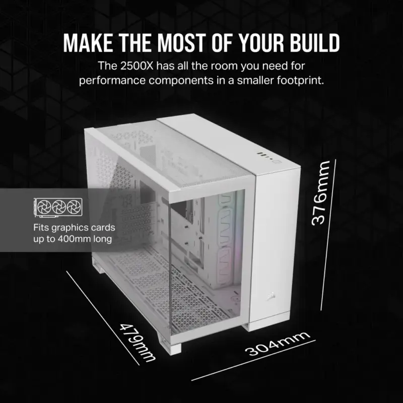 2500X RGB Micro ATX White Dual Chamber PC Case; 2x 3.5” | 2x 2.5” Drive Bays; Up to 360mm Radiator; 2x 120mm fan incl