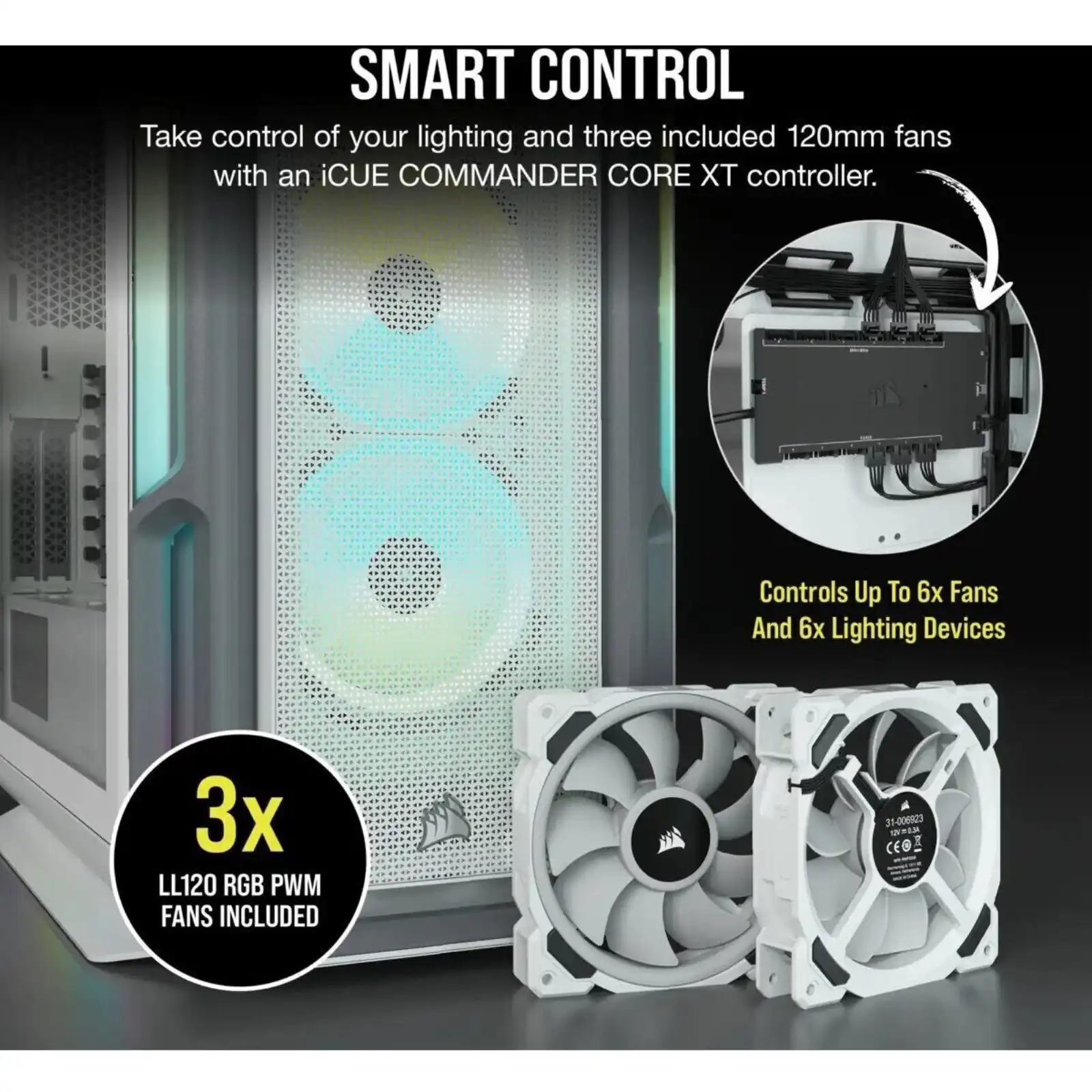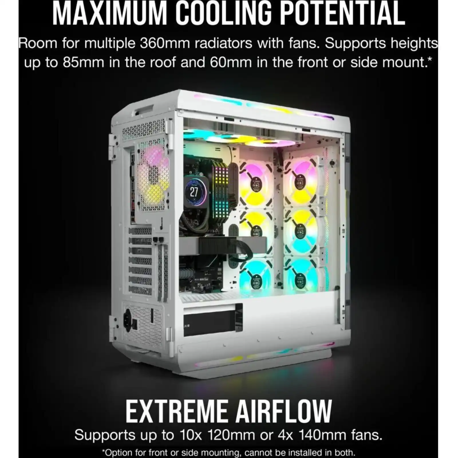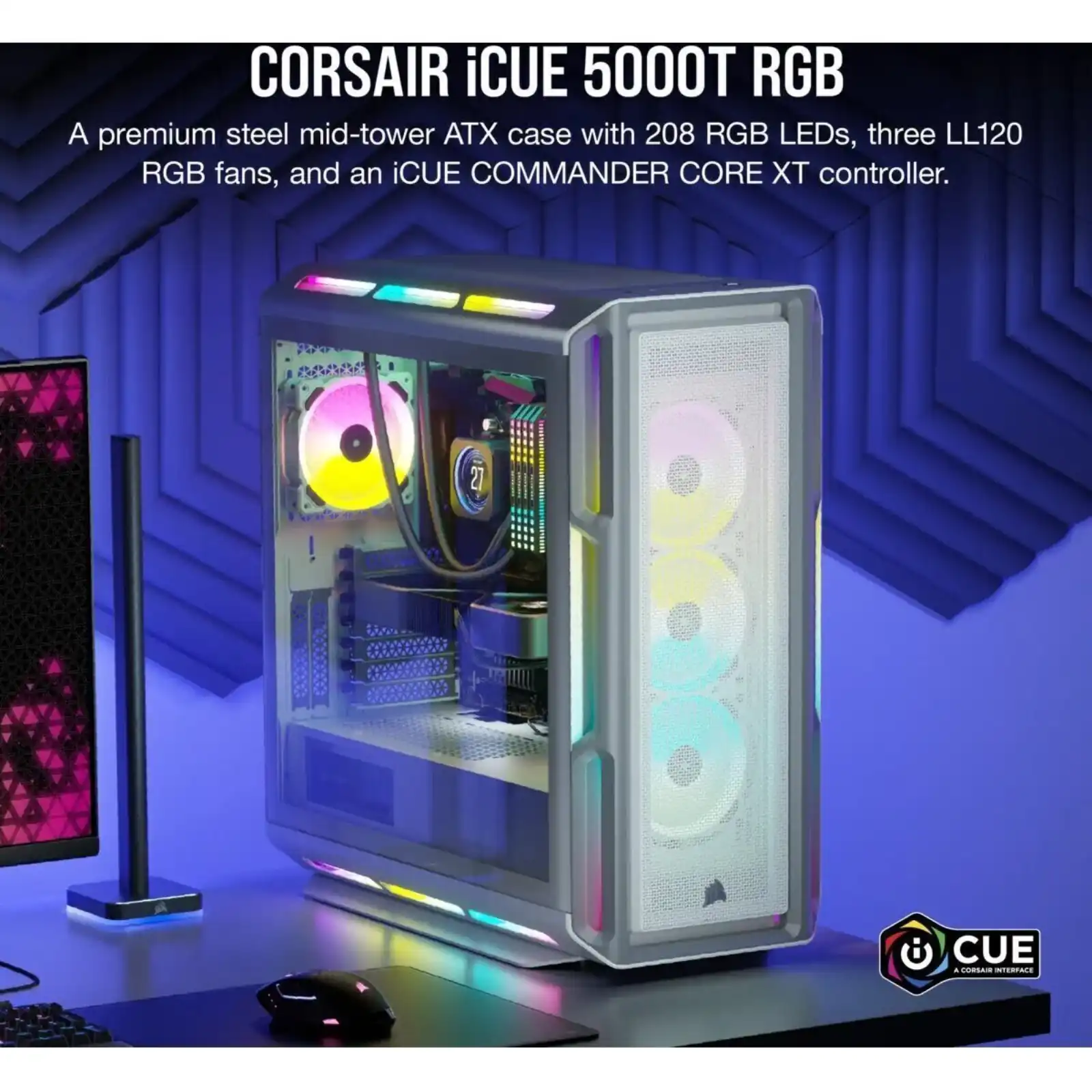 5000T RGB White Tempered Glass Mid-Tower; 2x 3.5” | 4x 2.5” Drive Bays; Up to 360mm Radiator compatible; 4x 120mm fan incl
