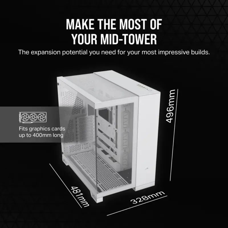 6500X Mid-Tower White Dual Chamber PC Case; 2x 3.5” | 2x 2.5” Drive Bays; Up to 360mm Radiator compatible; Supports BTF