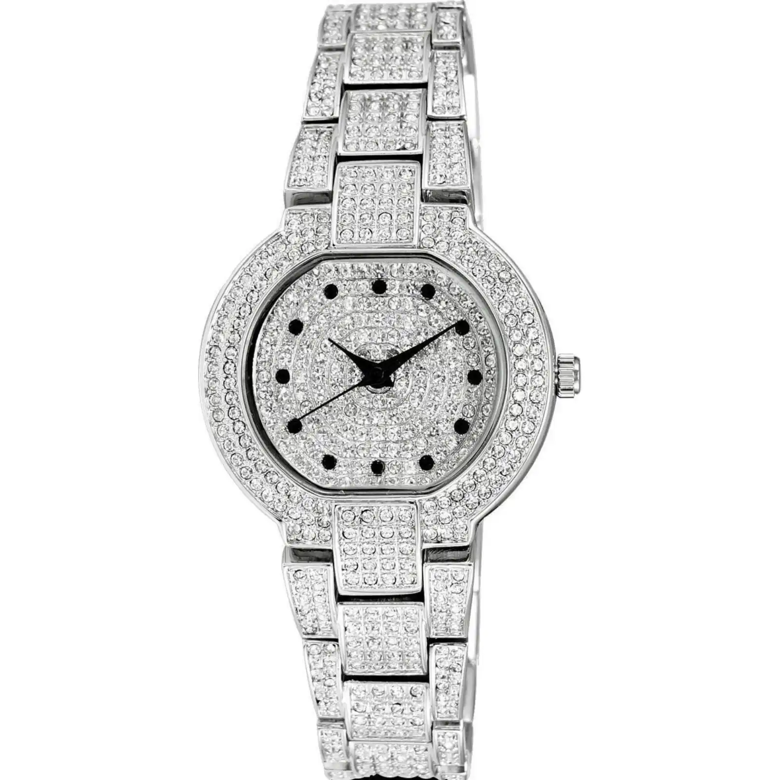 Features: Brass Rhodium Plated Case Brass Rhodium Plated Bracelet Quartz Movement Caliber: Miyota 2035 Mineral Crystal Silver Dial Analog Display Crystal Accents Brass Rhodium Plated Dial 164 Pcs Austrian Stone Pull/Push Crown Solid Case Back Deployment Clasp 30m Water Resistance Approximate Case Diameter: 32mm Approximate Case Thickness: 10.25mm nbsp;