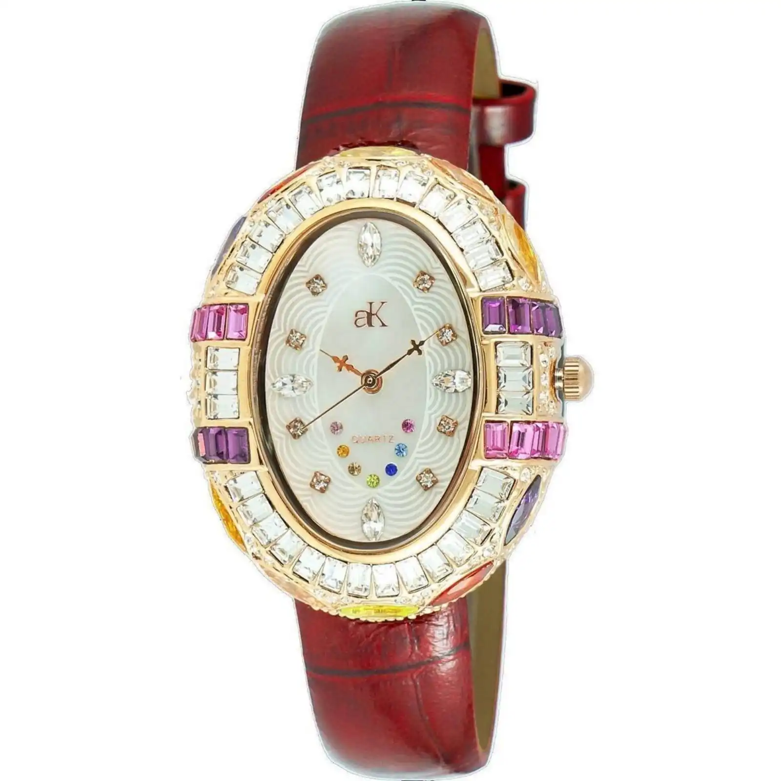 Features: Brass Rhodium Plated Case Genuine Red Leather Strap Quartz Movement Mineral Crystal White Mother Of Pearl Dial Analog Display Crystal Accents 12 Pcs White, 6 Pcs Multi-Color Crystal Dial Pull/Push Crown Solid Case Back Buckle Clasp 30m Water Resistance Approximate Case Diameter: 34mm Approximate Case Thickness: 11mm