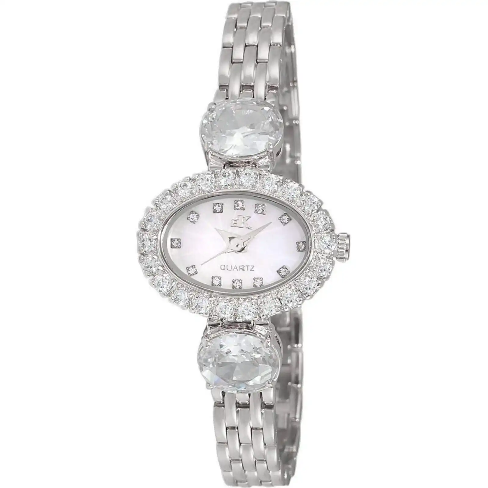 Features: Brass Rhodium Plated Case Brass Rhodium Plated Bracelet Quartz Movement Caliber: Miyota 2025 Mineral Crystal Mother Of Pearl Dial Analog Display Crystal Accents 12 Pcs Austrian Setting Pull/Push Crown Solid Case Back Deployment Clasp 30m Water Resistance Approximate Case Diameter: 31mm Approximate Case Thickness: 25mm