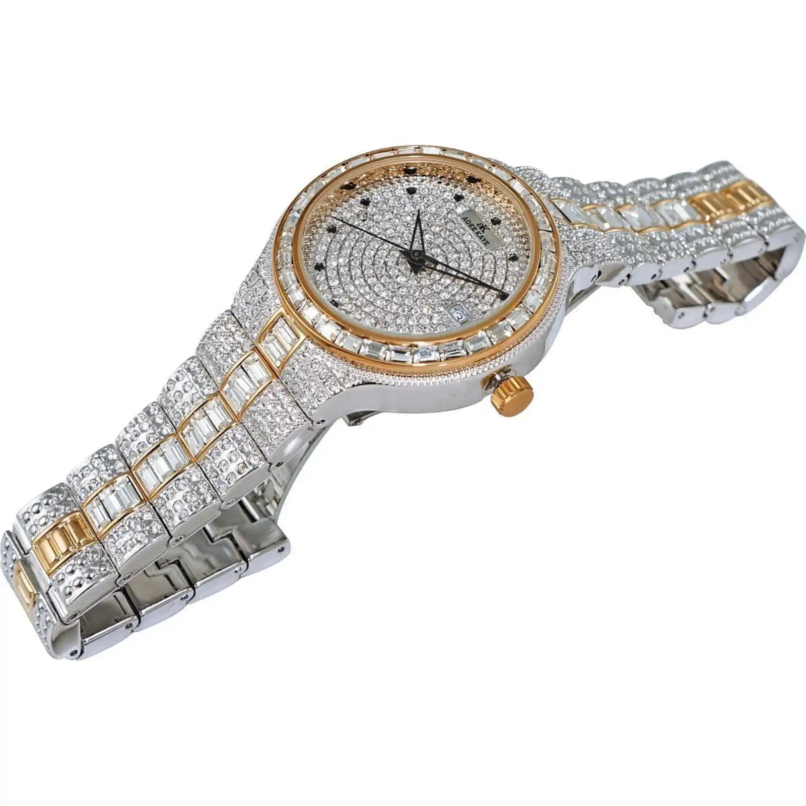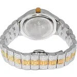 Features: Gold Tone Brass Rhodium Plated Case Gold Tone Brass Rhodium Plated Stainless Steel Bracelet Quartz Movement Mineral Crystal Pave Dial Analog Display Diamond Accents 12 Pcs Black Stones, 126 Pcs White Stones Pull/Push Crown Solid Case Back Deployment Clasp 30m Water Resistance Approximate Case Diameter: 31mm Approximate Case Thickness: 10mm