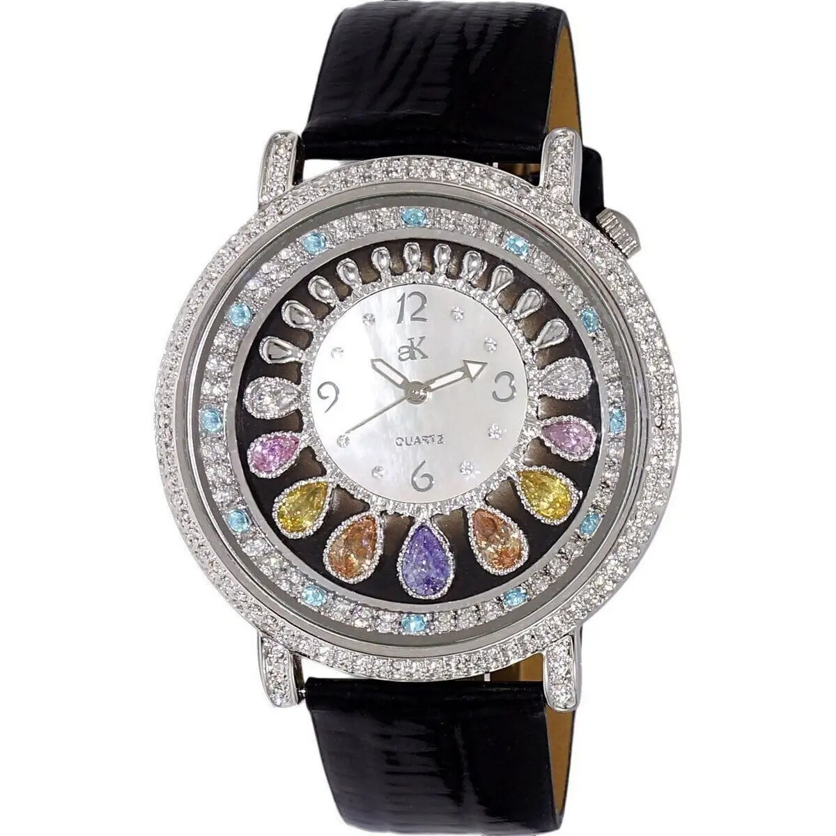 Features: Brass Rhodium Plated Case Genuine Black Leather Strap Quartz Movement Caliber: Miyota-2035 Mineral Crystal White Mother Of Pearl Dial Analog Display Crystal Accents 8 Pcs White And 9 Pcs Multi-Color Crystal Luminous Hands Pull/Push Crown Solid Case Back Buckle Clasp 30m Water Resistance Approximate Case Diameter: 47.5mm Approximate Case Thickness: 12mm