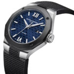 The dial of the Riviera 10768 is a masterpiece of texture and light. Finished in a lacquered dark blue, it features the collection’s signature tone-on-tone wave motif, which symbolizes the meeting of the mountains and the sea.