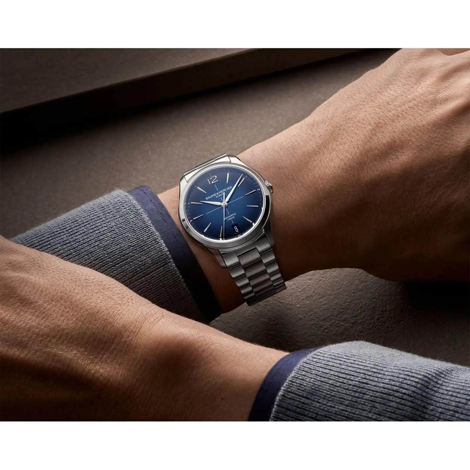 Through the translucent blue surface, the wearer can catch glimpses of the Baumatic movement’s gear trains and components. The legibility remains uncompromising thanks to the oversized Roman numerals and faceted indices, all treated with Super-LumiNova C1 (blue emission) for exceptional visibility in low-light conditions. The date aperture at 3 o’clock is subtly integrated, maintaining the dial’s balanced, symmetrical allure.