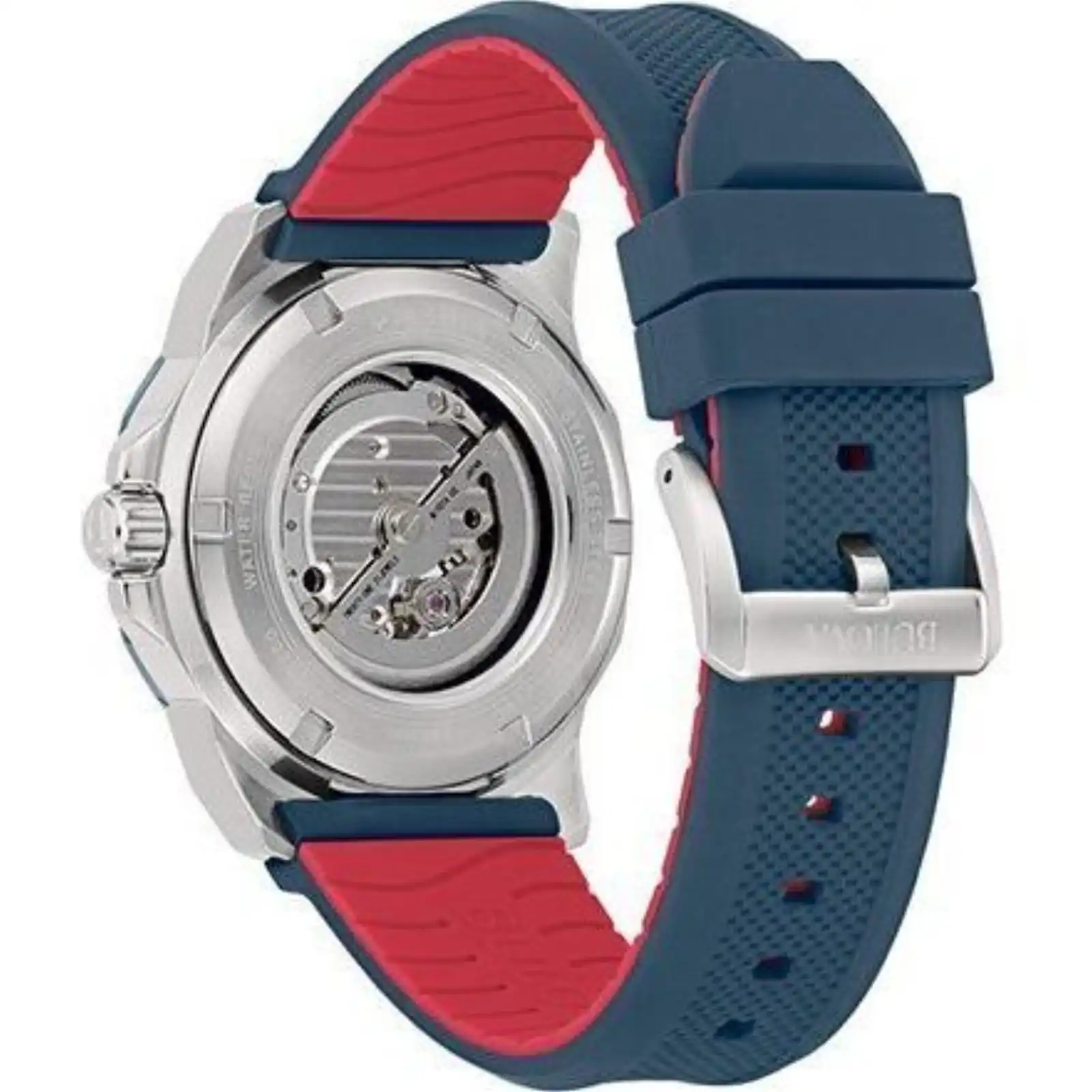 Stainless Steel Case Silicone Strap Automatic Movement Caliber: 82S5 21 Jewels Blue Dial Mineral Crystal Analog Display Open Heart Dial Power Reserve Upto 42 Hours Luminous Hands Screw Down Crown See Through Case Back Buckle Clasp 200m Water Resistance