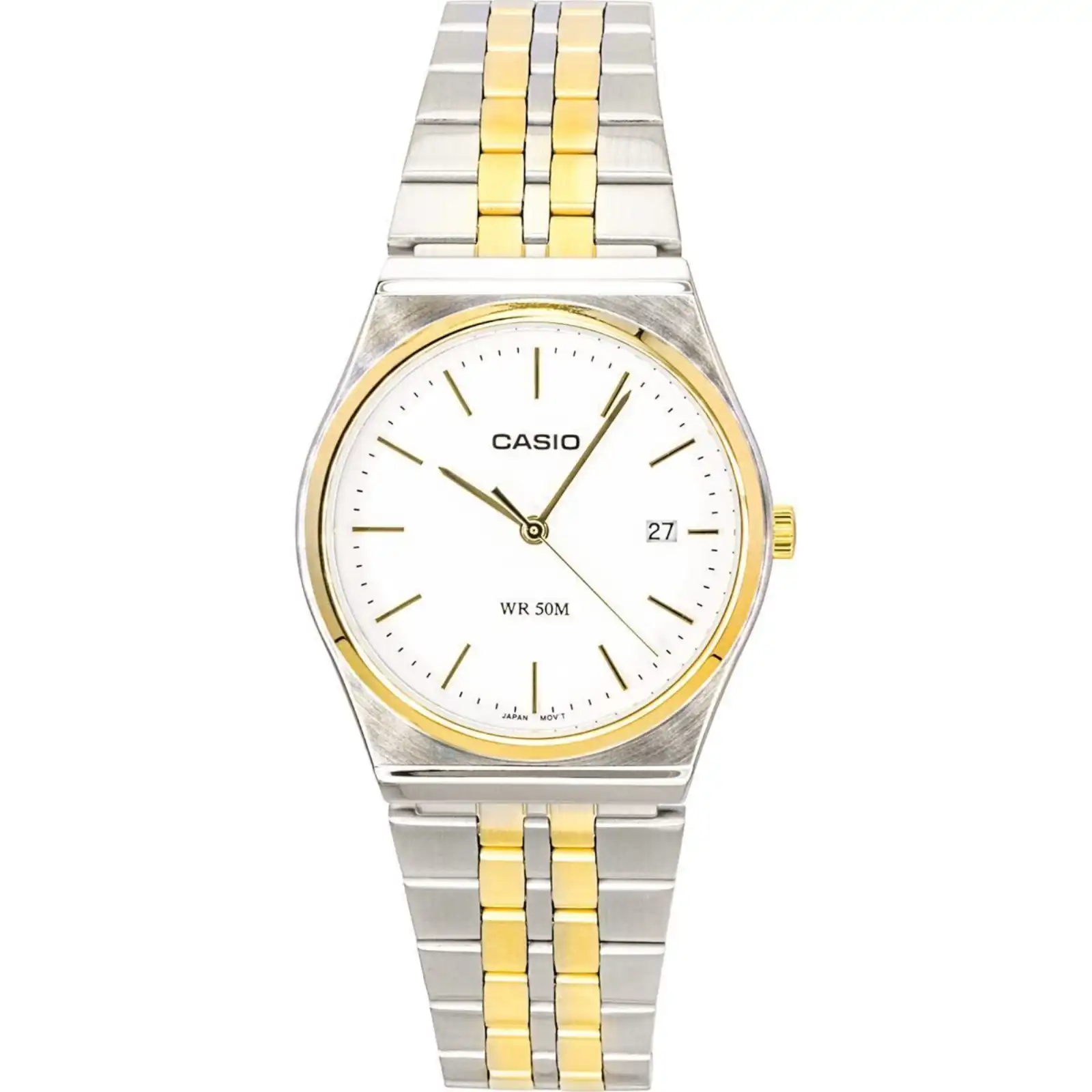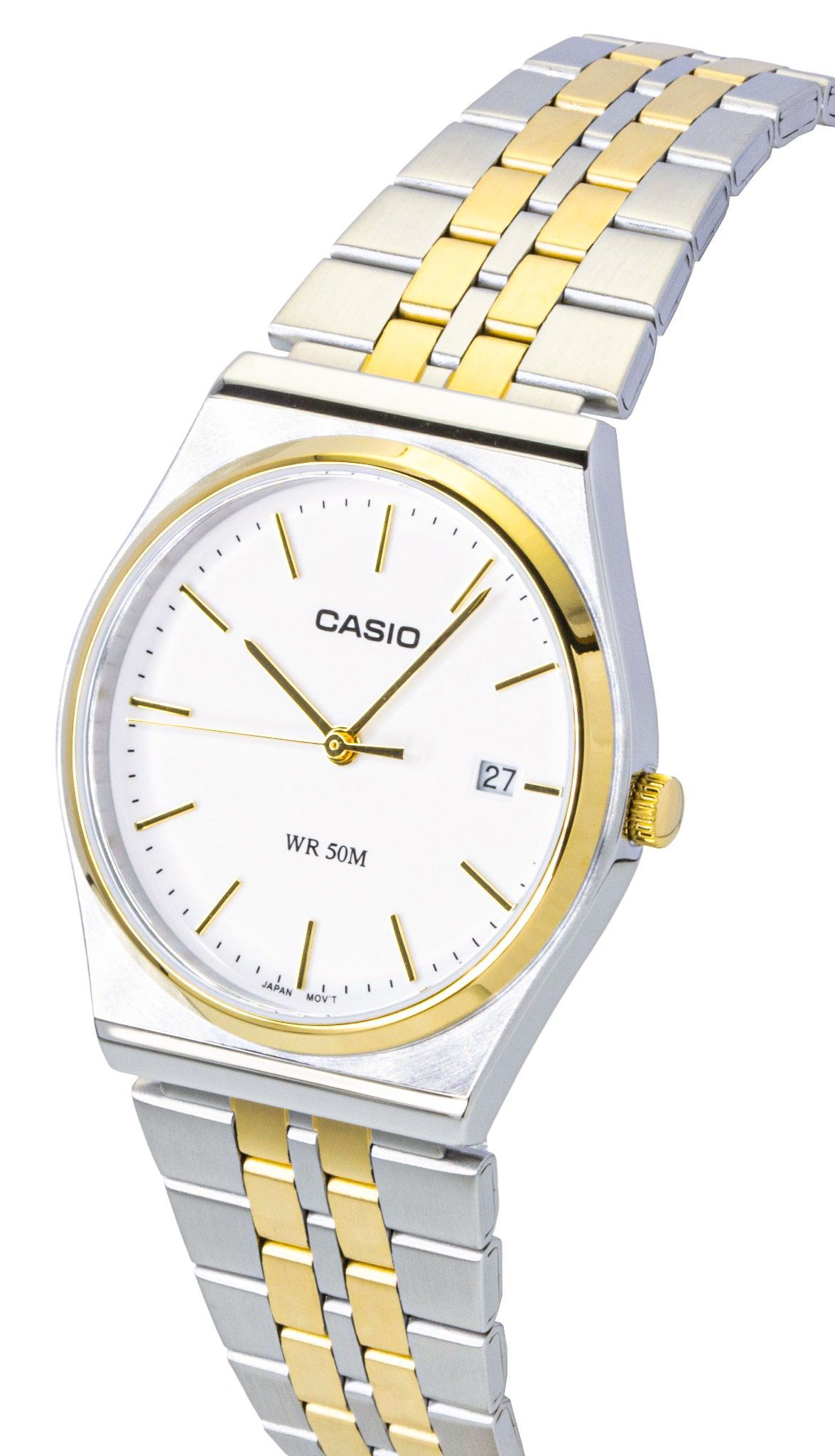 Casio MTP-B145SG-7AV offers a sophisticated two-tone stainless steel design with a classic white dial, making it the perfect accessory for any occasion. The reliable quartz movement ensures accurate timekeeping, while the stainless steel construction guarantees both durability and a polished look. The minimalist design of this timepiece is enhanced by its easy-to-read markers and simple elegance, making it versatile enough for both casual and formal settings. Whether for everyday use or a special event, this watch blends functionality with style, offering a timeless addition to any man’s collection.