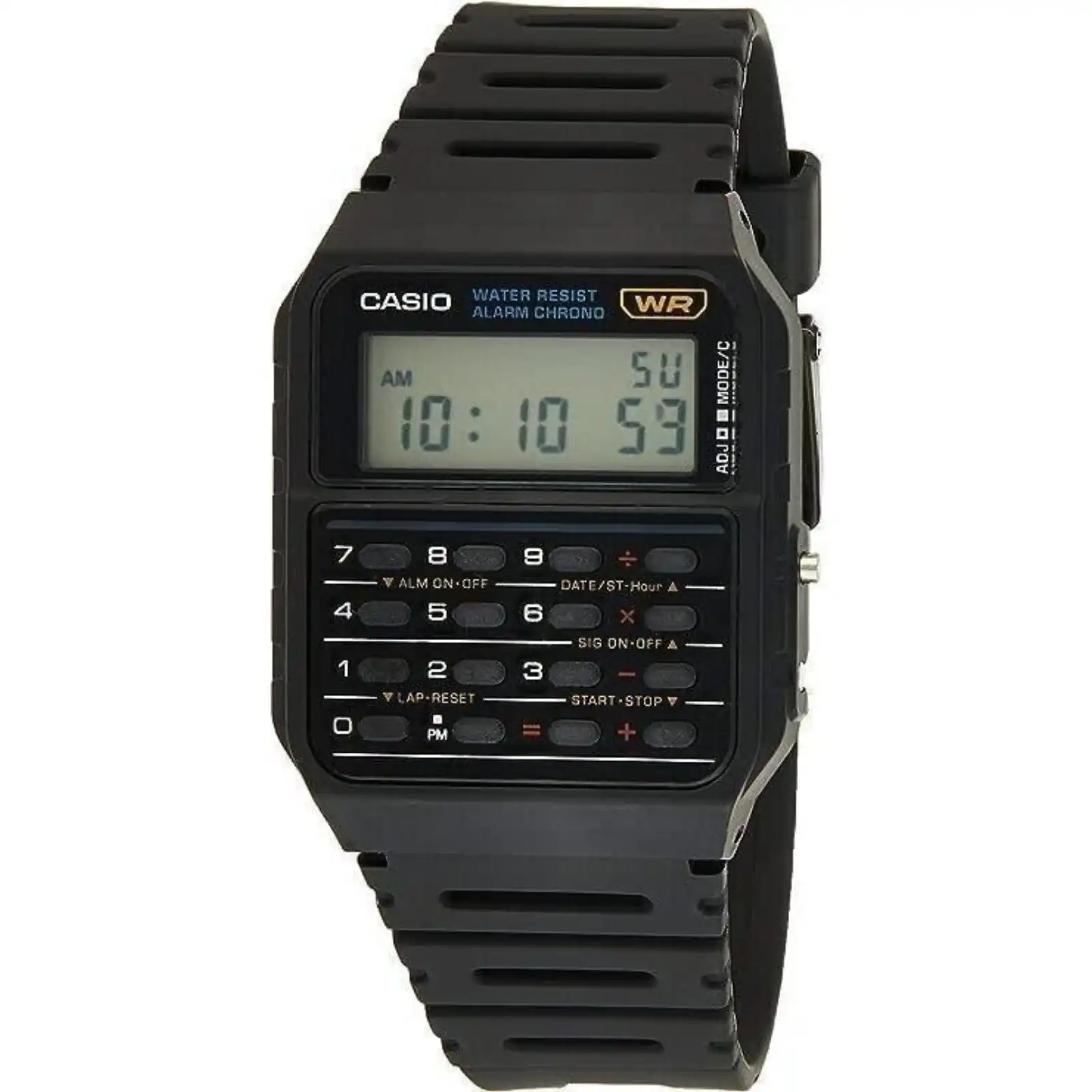 Resin Case Resin Strap 8-Digit Calculator Quartz Movement Digital Display Constants For Addition, Subtraction, Multiplication And Division Dual Time Daily Alarm Hourly Time Signals 1/100 Second Stopwatch 12/24 Hours Display Measuring Capacity Auto Calendar Overflow Check Indicated Screwed Case Back Water Resistance