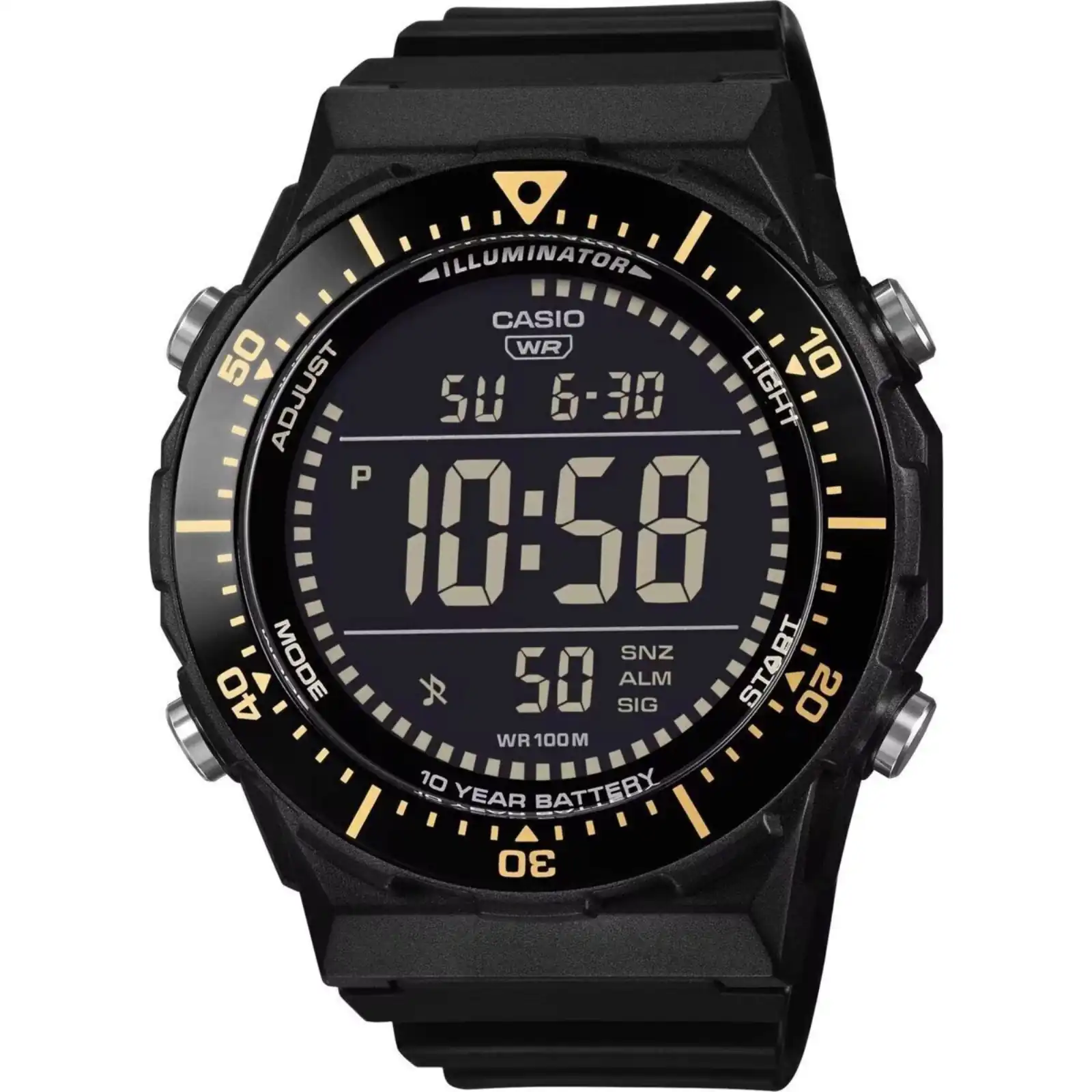 WR: 10 ATM – Case: 47 mm – Gender: Gent – Case Material: Resin – Strap Material: Resin – Movement: Quartz – Functions: Multifunction – Glass: Mineral – Product Type: Wristwatch – Packaging: Official Box