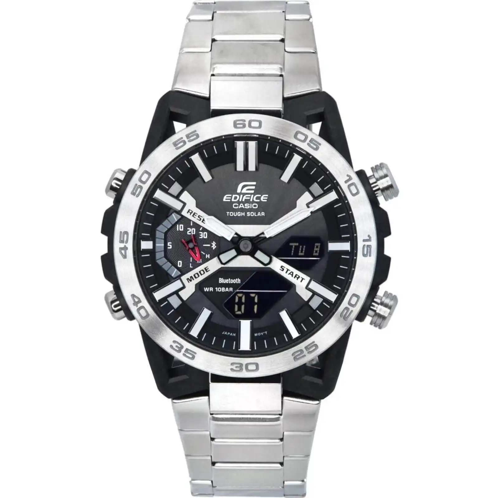 Carbon Case Stainless Steel Bracelet Solar Powered Caliber: 5698 Mineral Crystal Black Dial Analog Digital Display Mobile Link World Time Double LED Light 1/100-Second Stopwatch Countdown Timer 5 Daily Alarms Hourly Time Signal Full Auto-Calendar Button Operation Tone On/Off Power Saving Battery Level Indicator Hand Shift Feature 12/24 Hours Display Day And Date Display Screwed Case Back Deployment Clasp 100m Water Resistance