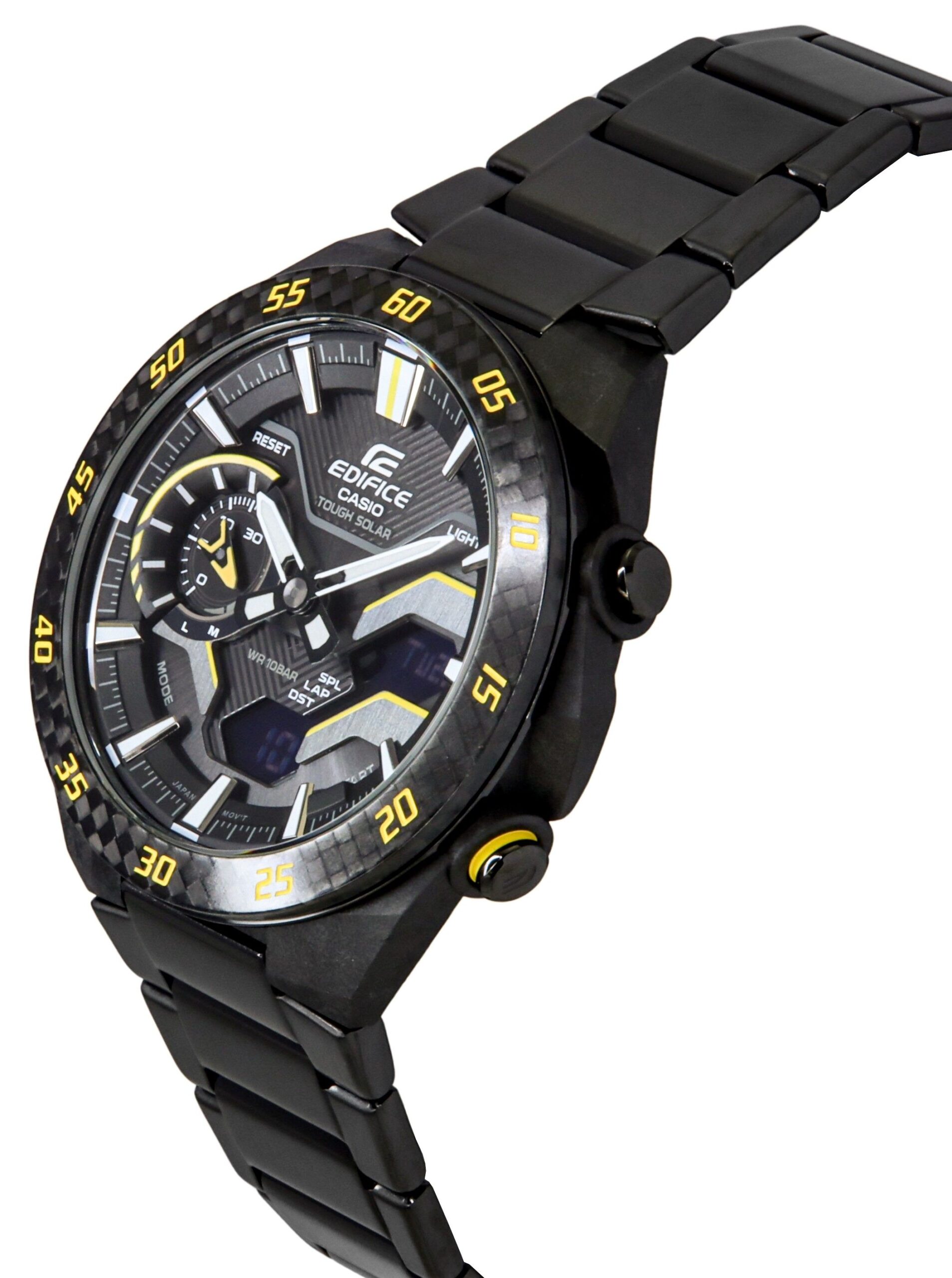 Carbon Case Stainless Steel Bracelet Tough Solar Mineral Crystal Black Dial Analog Digital Display Bluetooth Mobile Link Time And Place Phone Finder Neobrite World Time 38 Time Zones 1/100 Second Stopwatch Countdown Timer 5 Daily Alarms Hourly Time Signal Double LED Light Button Operation Tone On/Off Power Saving Regular Timekeeping Full Auto Calendar 12/24 Hours Display Luminous Hands And Markers Month, Day And Date Display Screwed Case Back Deployment Clasp 100M Water Resistance