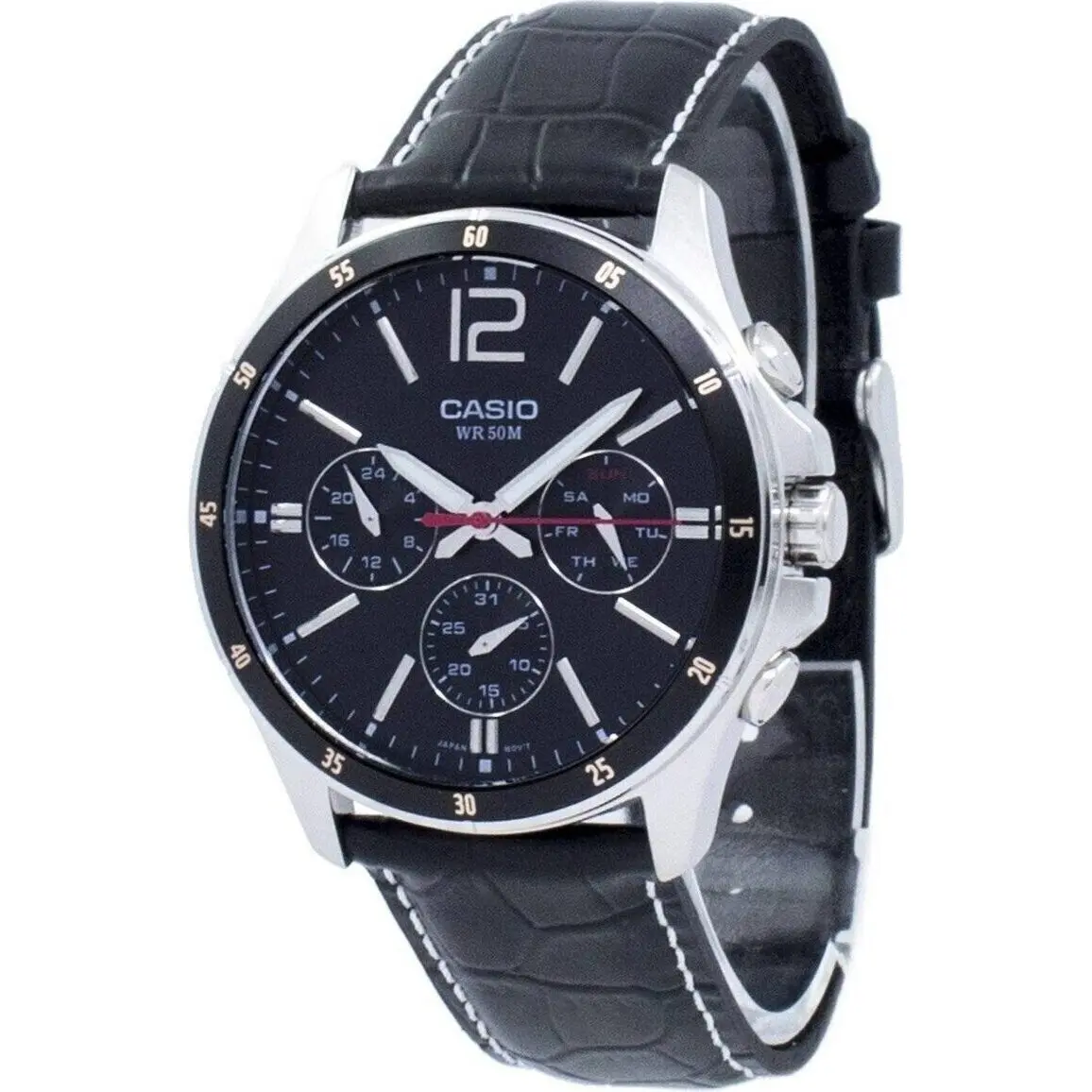 Case/Bezel Material: Ion Plated Stainless Steel Leather Strap Quartz Movement Mineral Crystal Black Dial Analog Display 24 Hours Sub Dial Regular Timekeeping Accuracy: ± 20 Seconds Per Month Luminous Hands Day And Date Display Pull/Push Crown Solid Case Back Buckle Clasp 50M Water Resistance