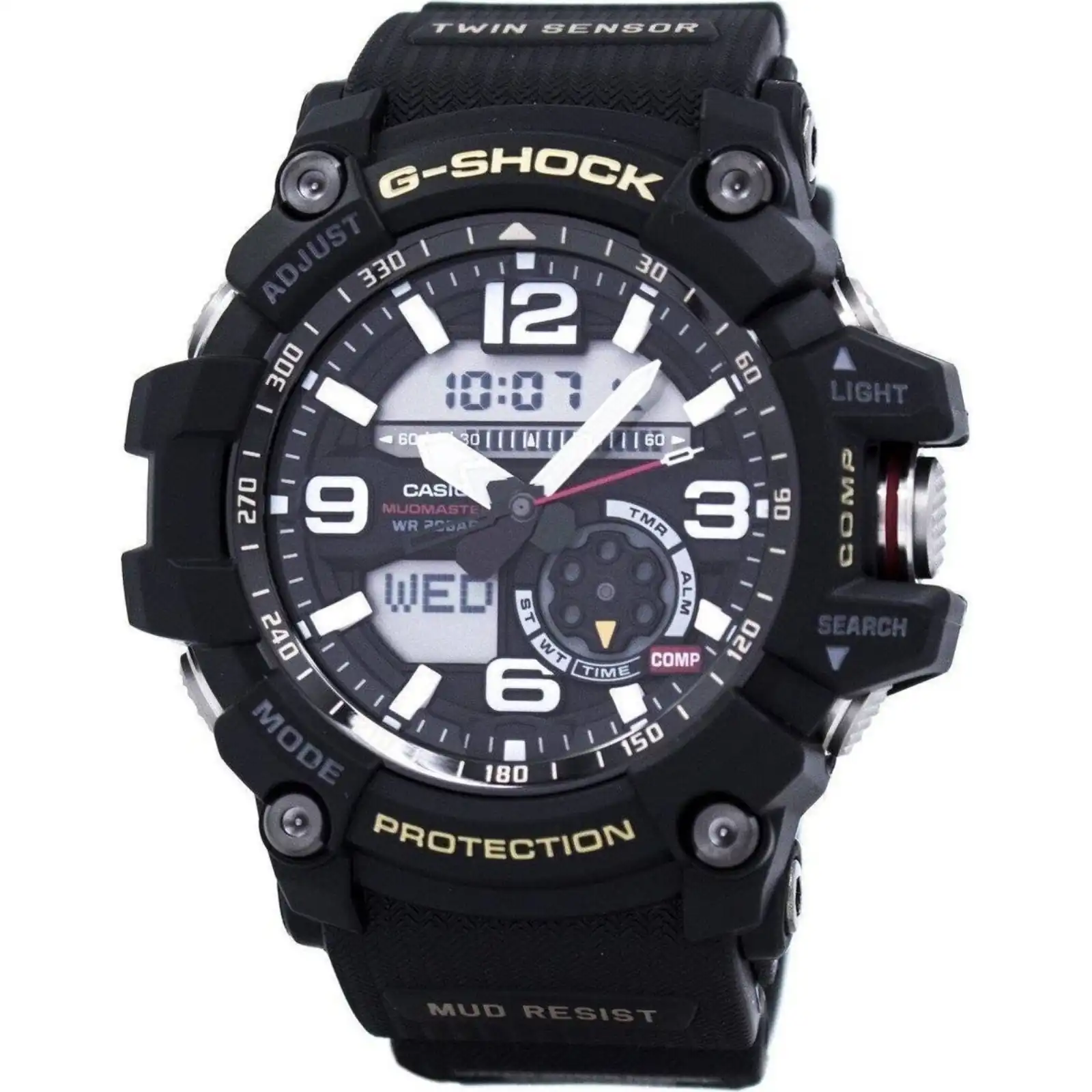 Case / Bezel Material: Resin/Stainless steel Resin Strap Mineral Crystal Analog Digital Display Shock Resistant Mud Resistant Twin Sensor Neobrite LED Backlight (Super Illuminator) Digital Compass Thermometer World Time 31 Time Zones (48 Cities + UTC) 1/100-Second Stopwatch Countdown Timer 5 Daily Alarms (With 1 Snooze Alarm) Hourly Time Signal Low Battery Alert Full Auto-Calendar (To Year 2099) 12/24-Hour Format Button Operation Tone On/Off Regular Timekeeping Accuracy: ±15 Seconds Per Month Luminous Hands And Markers Day Display Solid Case Back Buckle Clasp 200M Water Resistance
