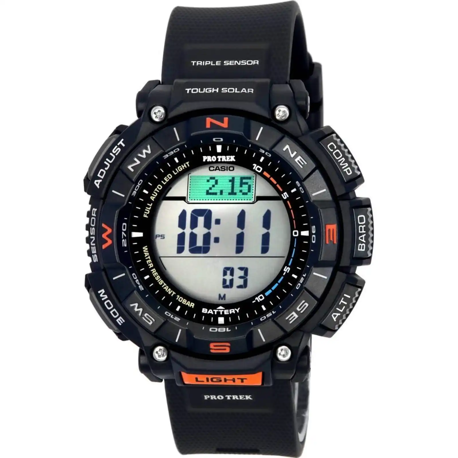 Biomass Plastic Case Soft Polyurethane Strap Solar Movement Caliber: 3513 Mineral Crystal Black Dial Digital Display Altimeter Barometer Thermometer Digital Compass Direction Bezel World Time Sunrise, Sunset Time Display 1/10 Second Stopwatch Countdown Timer 5 Daily Alarms Full Auto LED Backlight Duplex LC Display Low Temperature Resistant Hourly Time Signal Button Operation Tone On/Off Battery Level Indicator Regular Timekeeping Power Saving 12/24 Hours Display Day, Date And Month Display Rotating Bezel Screwed Case Back Buckle Clasp 100m Water Resistance