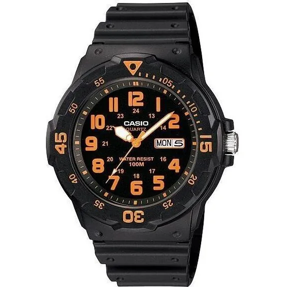 Features:Resin Case Resin Band Quartz Movement Resin Glass Black Dial Orange Color Accents Day/Date Display 12/24 Hr. Index Bi-Directional Rotating Bezel Accuracy: +/- 20 Seconds Per Month Buckle Clasp 100M Water Resistant