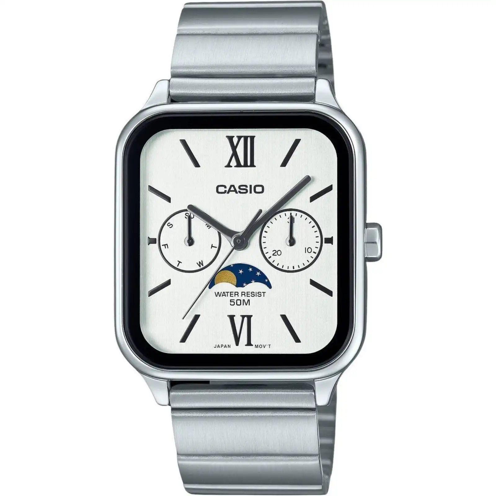 Casio Standard Analog Moon Phase Stainless Steel White Dial Quartz MTP-M305D-7A2V Men’s Watch