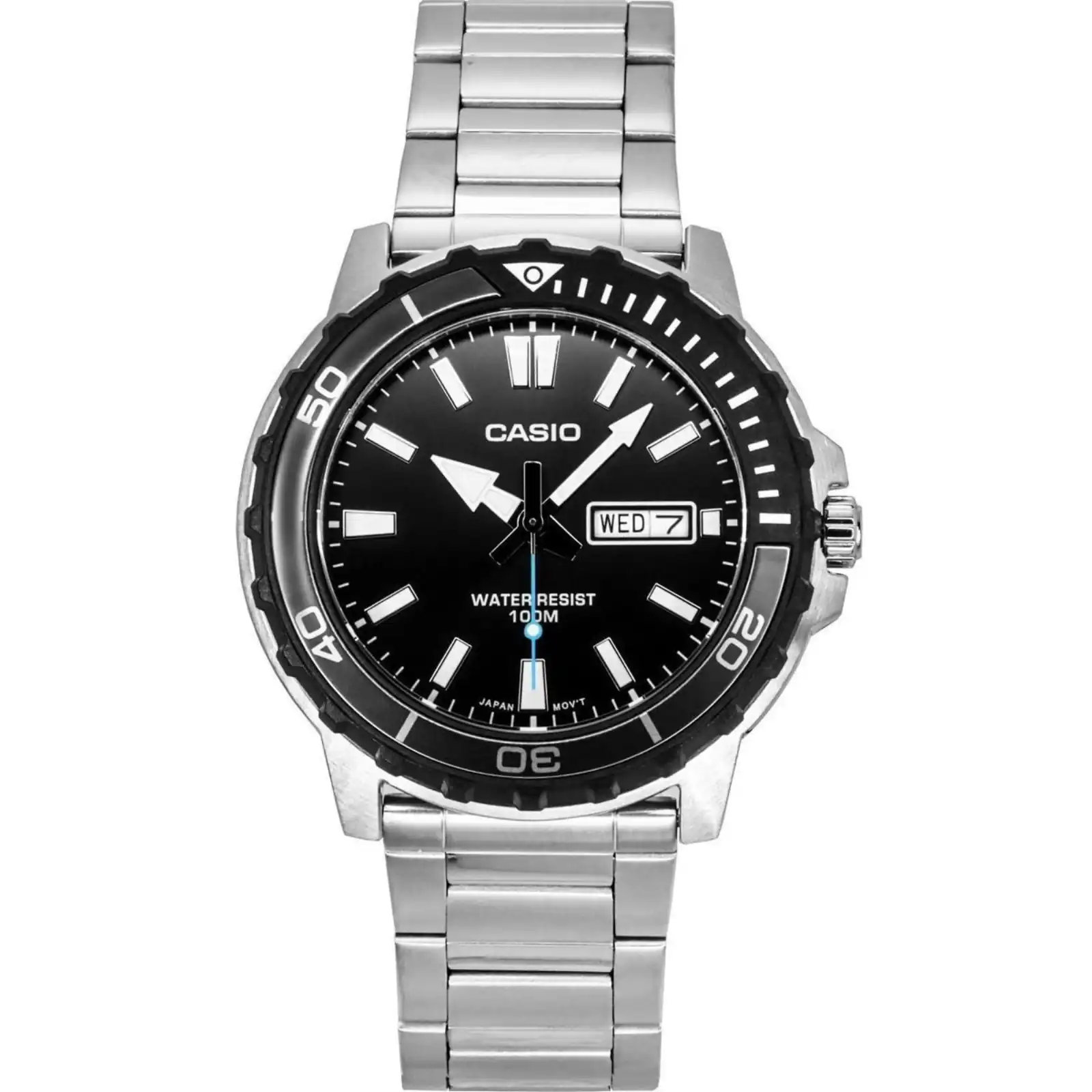 Stainless Steel Case Stainless Steel Bracelet Quartz Movement Mineral Crystal Black Dial Analog Display Timer Bezel Regular Timekeeping Luminous Hands And Markers Day And Date Display Uni Directional Rotating Bezel Solid Case Back Deployment Clasp 100M Water Resistance