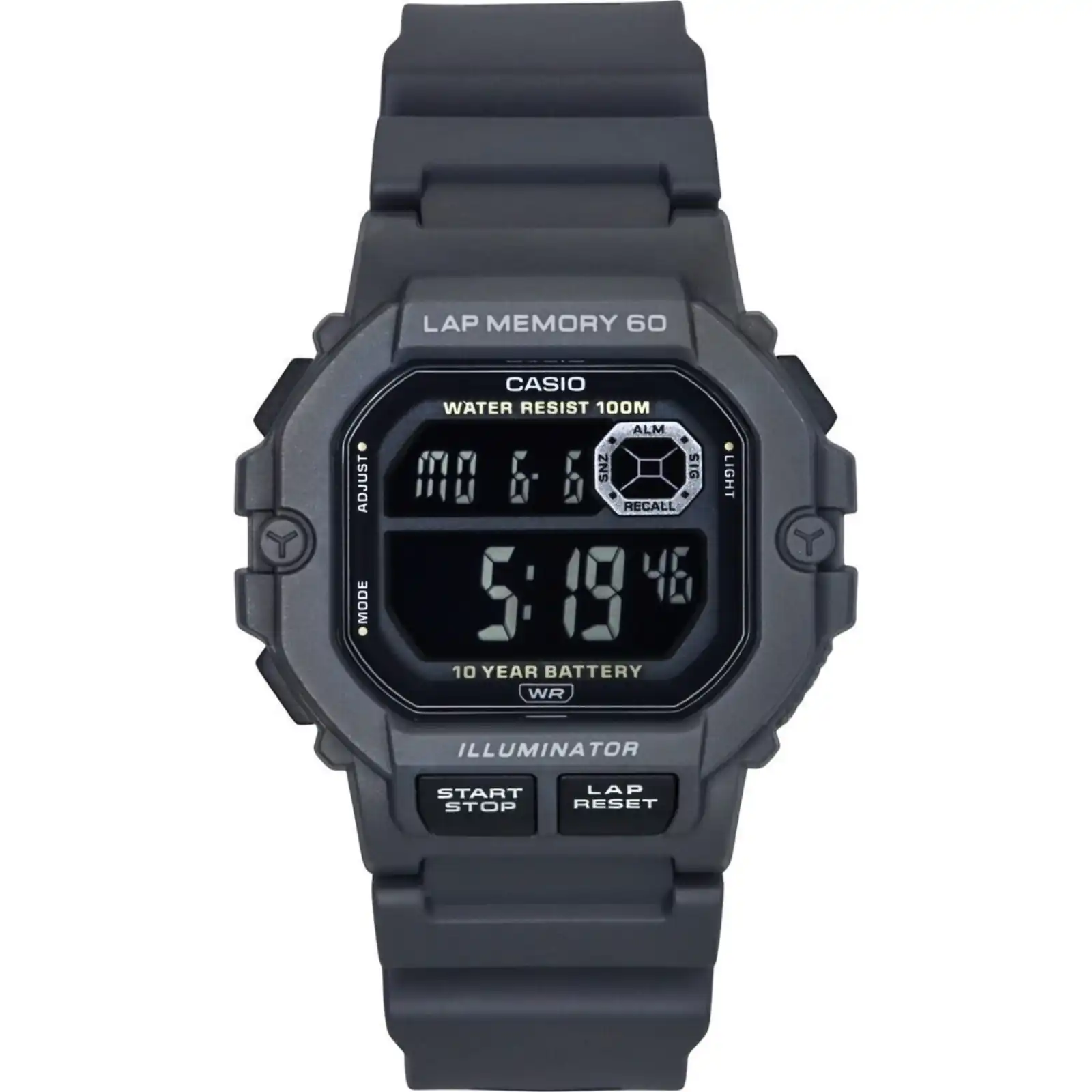 Resin Case Resin Strap Quartz Movement Resin Crystal Black Dial Digital Display Dual Time 1/100-Second Stopwatch Countdown Timer 3 Multi-Function Alarms Hourly Time Signal LED Light Afterglow Full Auto-Calendar Button Operation Tone On/Off 12/24 Hours Display Month, Day And Date Display Screwed Case Back Buckle Clasp 100M Water Resistance