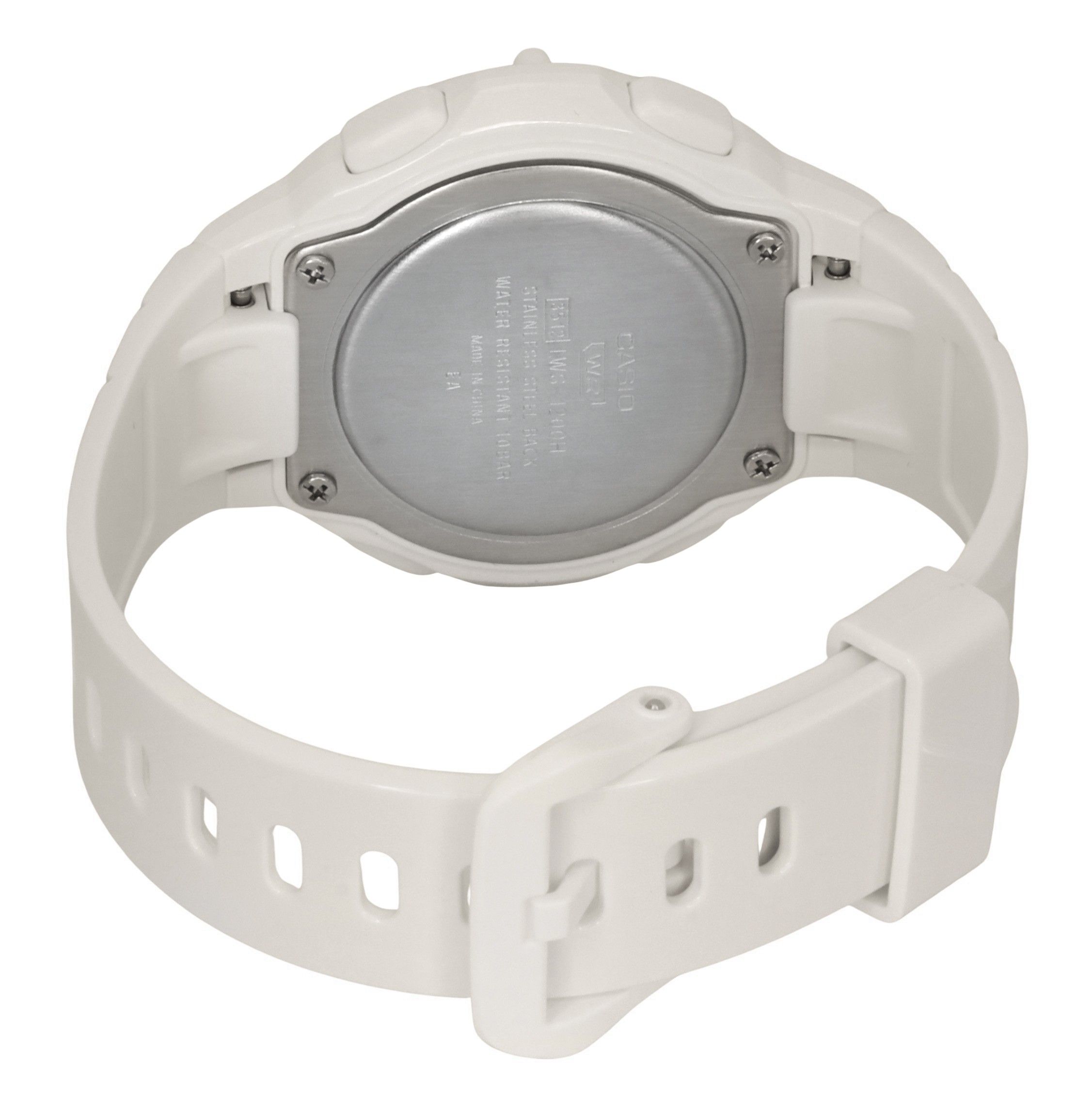 Resin Case White Resin Strap Quartz Movement Resin Crystal Blue Dial Digital Display Dual Time 1/100-Second Stopwatch Countdown Timer 3 Multi-Function Alarms Hourly Time Signal LED Light Full Auto-Calendar Button Operation Tone On/Off 12/24 Hours Display Month, Day And Date Display Screwed Case Back Buckle Clasp 100M Water Resistance