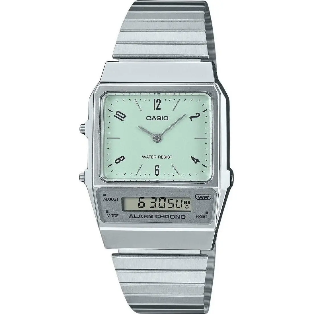 Casio Vintage Analog Digital Dual Time Stainless Steel Bracelet Green Dial Quartz AQ-800E-3A Unisex Watch