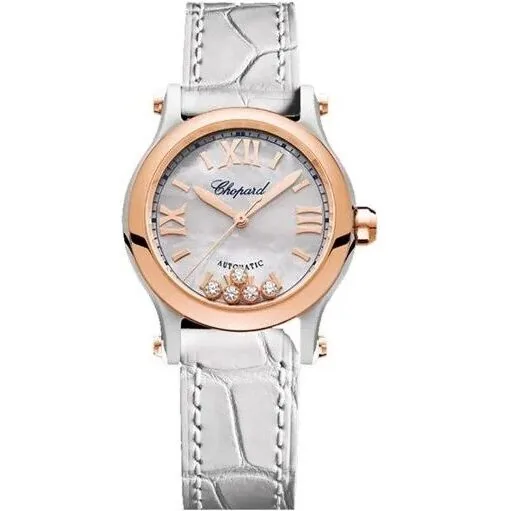 The Chopard Happy Sport 278573-6018 is a celebration of light and movement. Housed in a 30mm case of Lucent Steel™ and 18-carat ethical rose gold, this timepiece is the quintessential “Sport-Chic” accessory. It features Chopard’s legendary dancing diamonds—five brilliant-cut stones that glide across a shimmering white mother-of-pearl dial, offering a playful yet sophisticated horological experience.
