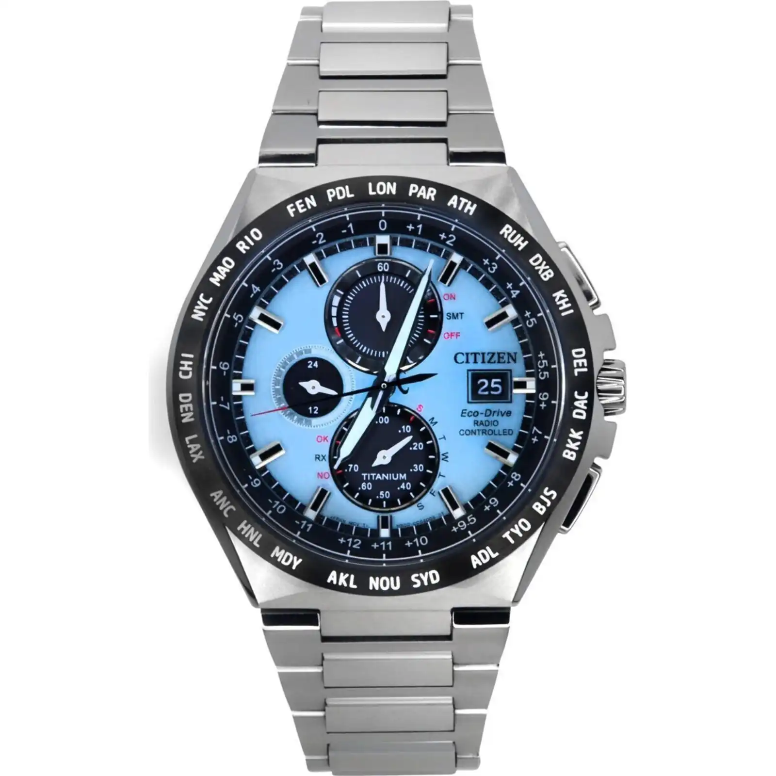 Citizen Eco-Drive Radio Controlled GMT Chronograph Super Titanium Light Blue Dial AT8238-84M 100M Men’s Watch