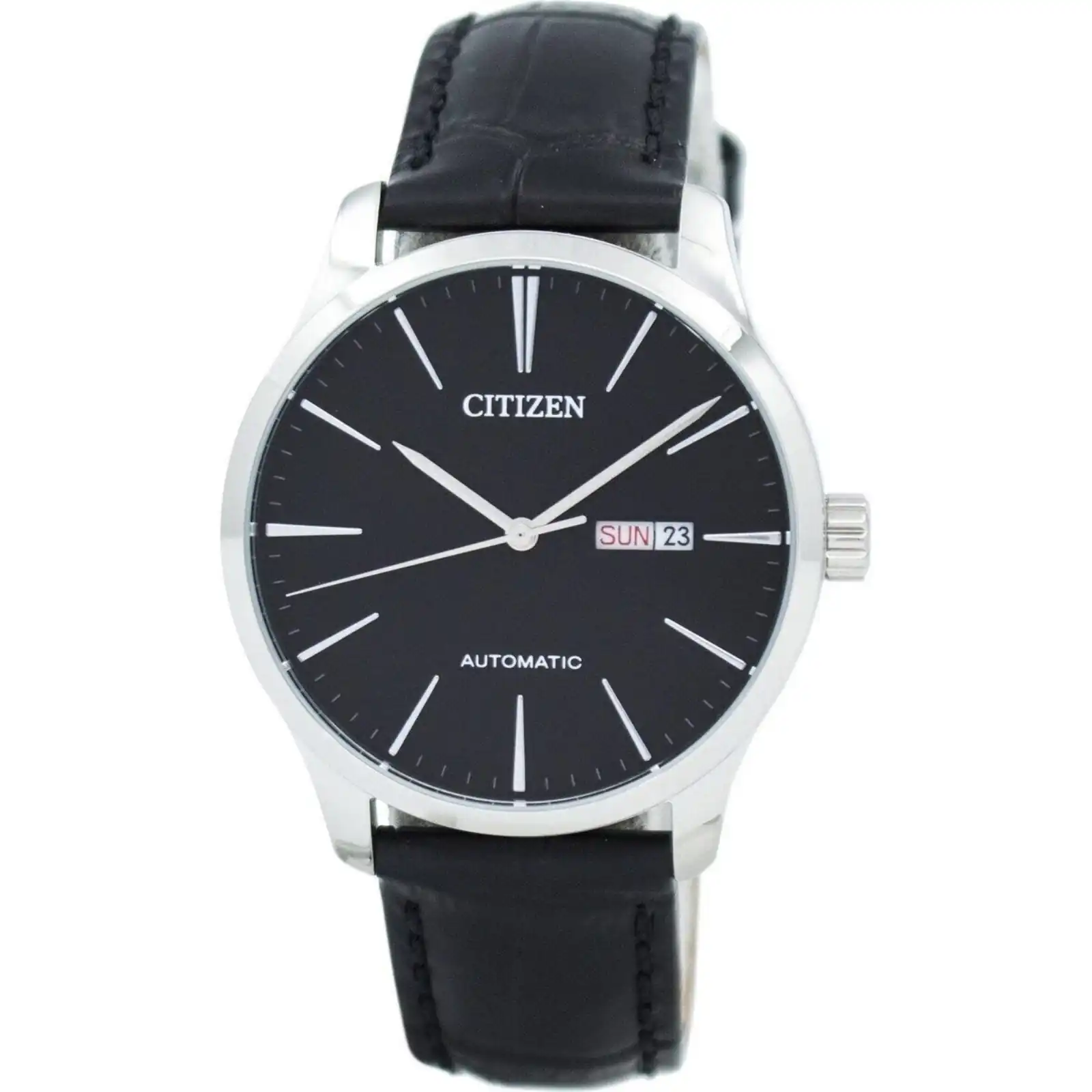Stainless Steel Case Black Leather Strap Automatic Movement Caliber: 8200 Mineral Crystal Black Dial Silver Tone Hands And Markers Day And Date Display Pull/Pull Crown Solid Case Back Buckle Clasp 50M Water Resistance