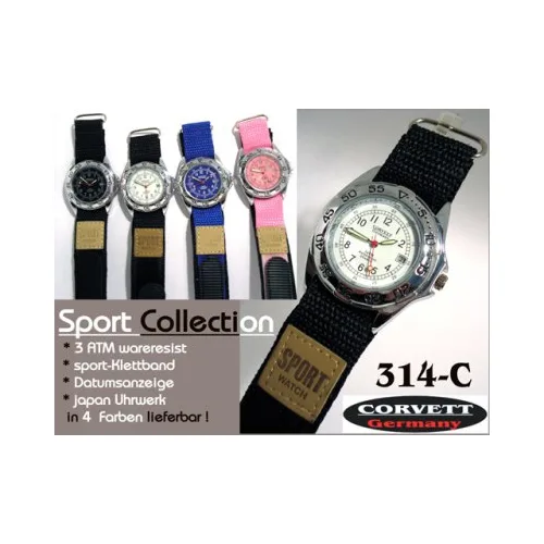 Corvett ladies or mens watch, Sports watch, black nylon strap mit velcro closure, Water Resistant, Date display, japanese quartz movement.