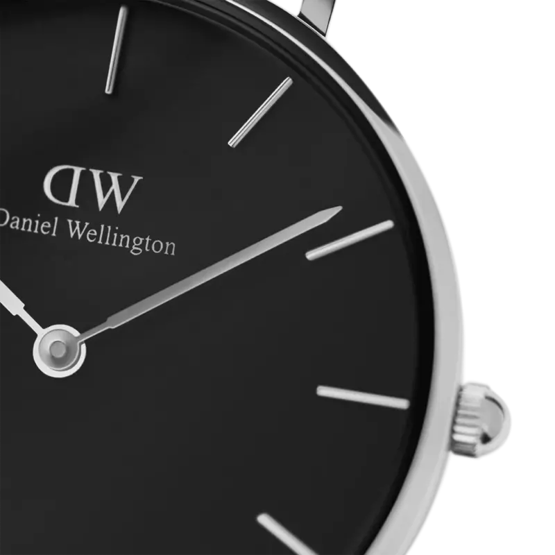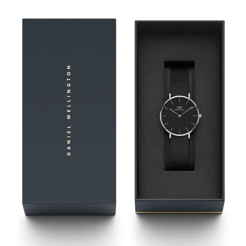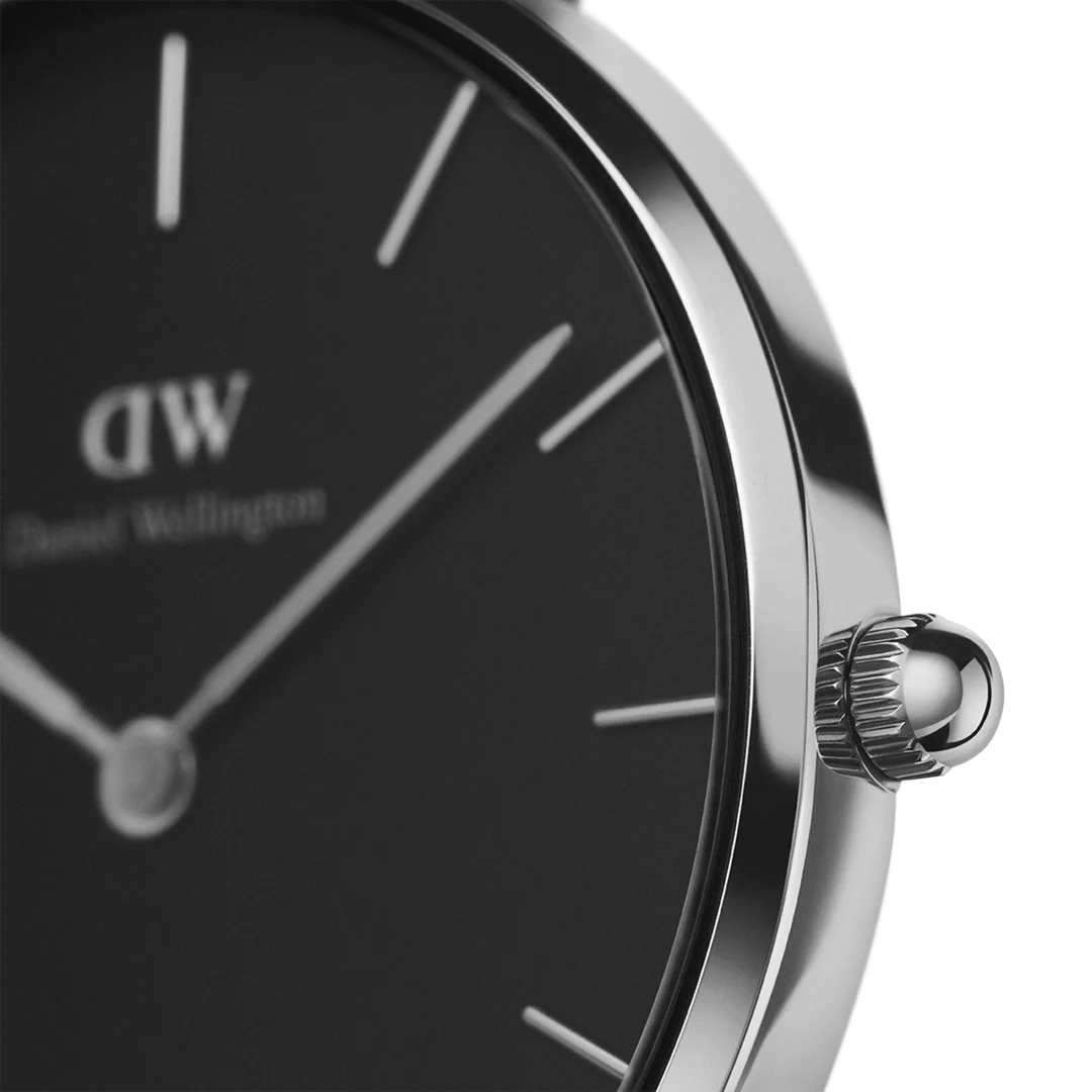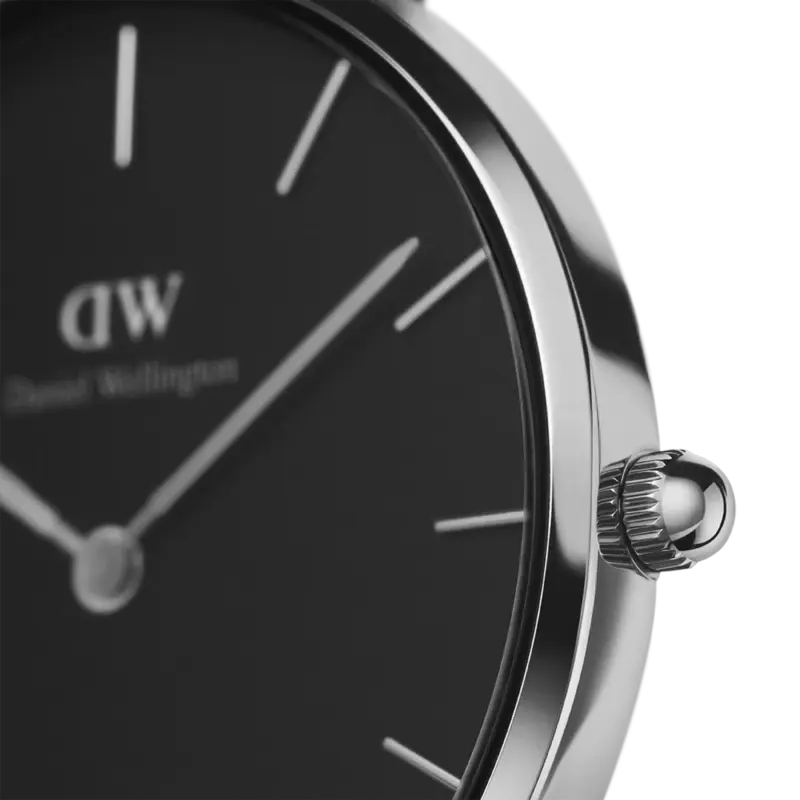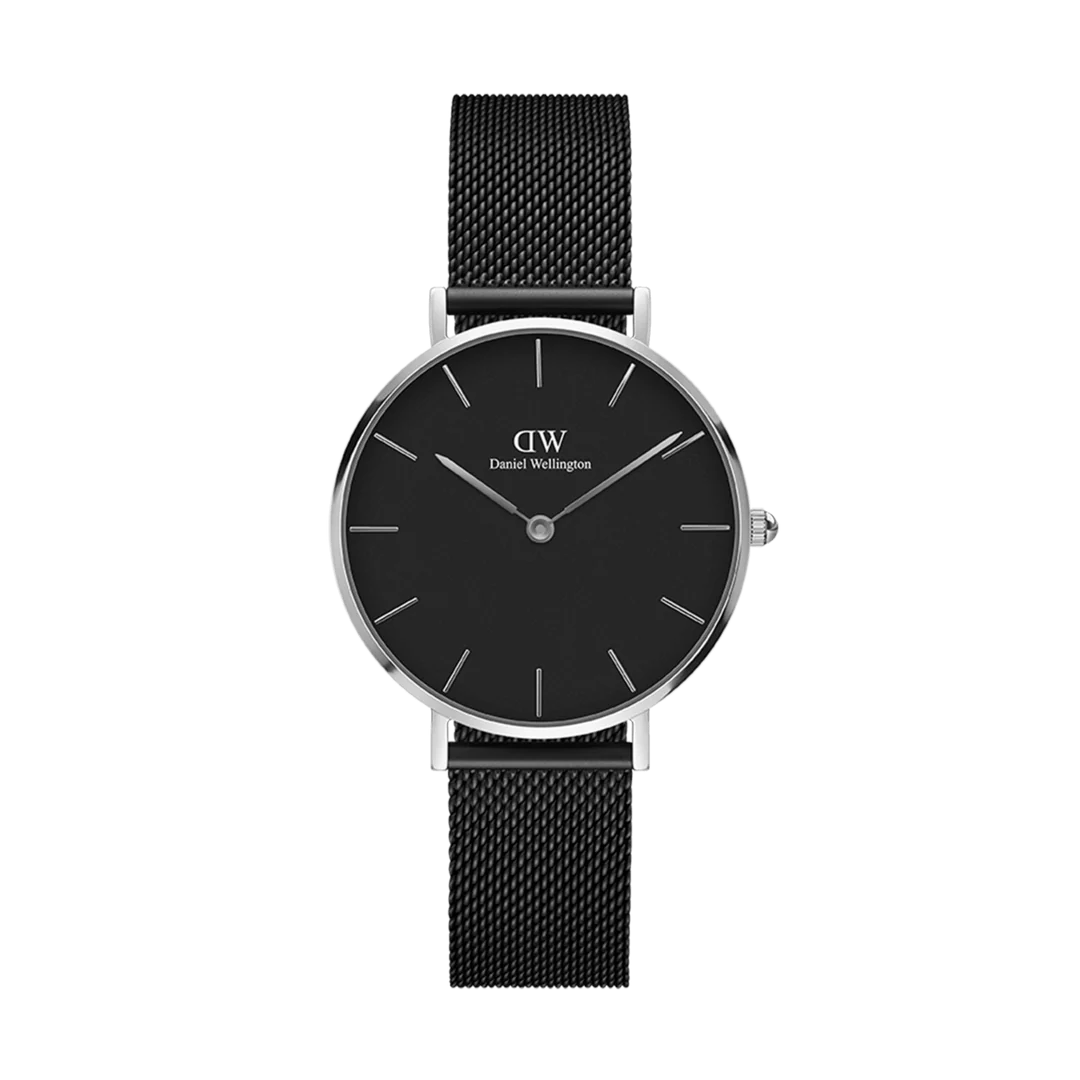 The Daniel Wellington Petite Ashfield 32mm (DW00100202) is a bold reimagining of the classic silver watch. By combining a high-polished silver case with a deep matte black dial and matching mesh strap, Daniel Wellington has created a timepiece that is both edgy and undeniably elegant. Designed for the modern woman who values “quiet luxury,” the Ashfield is a foundational accessory that transitions effortlessly from the boardroom to an evening out.