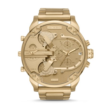 The Diesel Mr. Daddy 2.0 DZ7399 is a high-impact 57mm timepiece that defines the “Maximalist” category. Combining a monochromatic yellow gold-tone stainless steel finish with a matching gold sunray dial, this watch offers an aggressive, opulent look that is impossible to ignore.