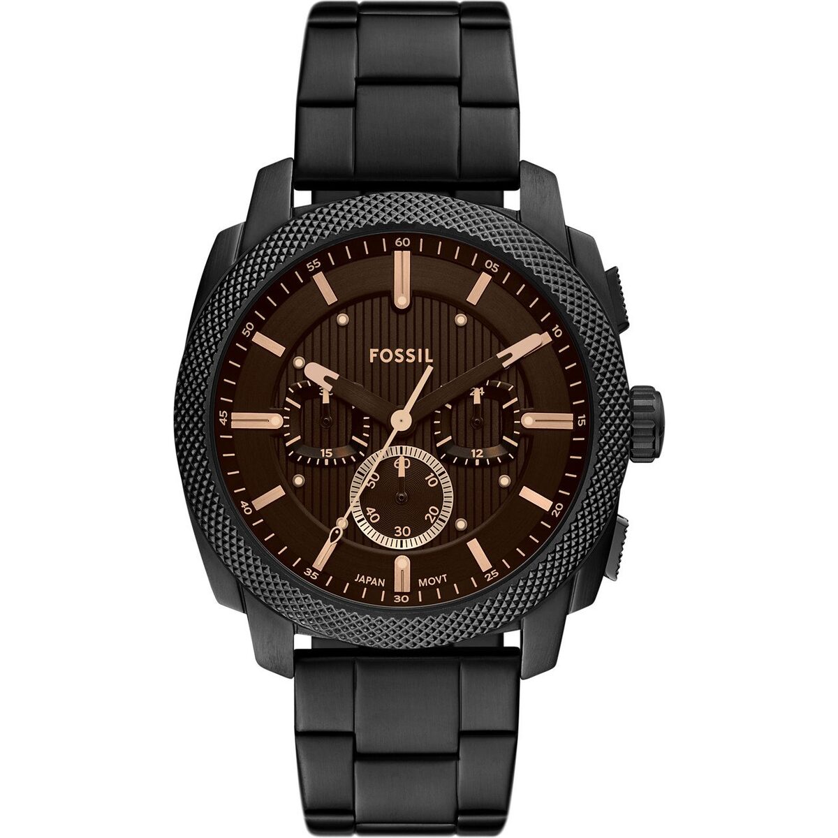 The Fossil Machine Chronograph (FS6097) is a masterclass in industrial-inspired horology. Featuring the collection’s signature knurled top ring and a bold 44mm silhouette, this timepiece draws its DNA from the rugged world of classic American machinery. Finished in deep black Ion-Plating and protected by a unique amber-tinted crystal, the FS6097 is the ultimate accessory for the modern man who leads with confidence and precision.