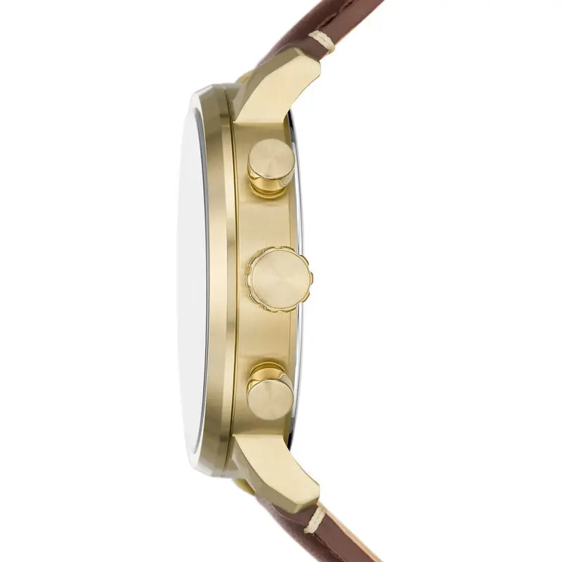 To preserve the beauty of your Fossil Rhett BQ2848, we recommend cleaning the gold-tone case with a soft microfibre cloth after daily wear. The LiteHide™ leather strap is a natural product; avoid prolonged exposure to water, heavy perspiration, and perfumes to prevent staining or premature aging. While the watch is water-resistant to 50 metres, it is best to remove it before showering or swimming to protect the natural leather oils. When not in use, store your timepiece in a cool, dry place away from direct sunlight to maintain the vibrancy of the blue sunray dial.
