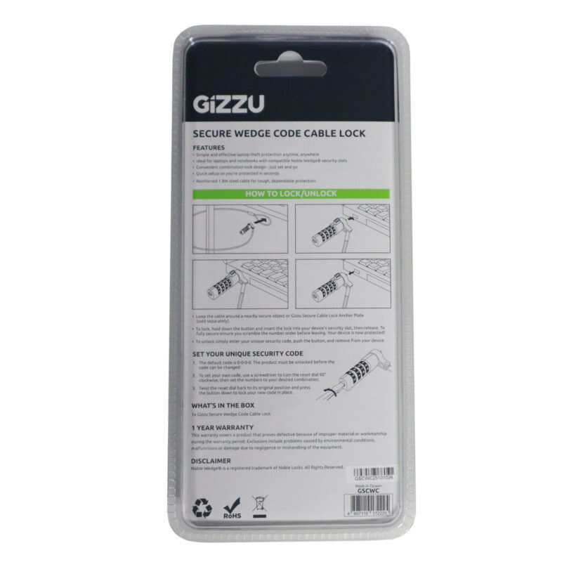 Keep your valuable devices safe with the Gizzu Secure Wedge Code Cable Lock—a reliable and convenient anti-theft solution designed for modern laptops, notebooks, desktops, and any compatible device equipped with a Noble Wedge® security slot. Whether you’re working in a public space, classroom, office, or shared environment, this combination lock provides instant peace of mind with easy installation and durable build quality.