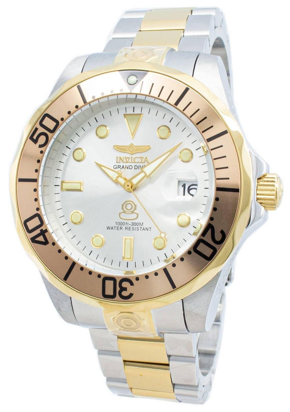 Features: Stainless Steel Case Two Tone Stainless Steel Bracelet Automatic Movement Caliber: NH35A 24 Jewels Mineral Crystal Silver Dial Analog Display Luminous Hands And Markers Date Display Uni-Directional Rotating Bezel Screw Down Crown See Through Case Back Deployment Clasp 300M Water Resistance Approximate Case Diameter: 47mm Approximate Case Thickness: 16mm