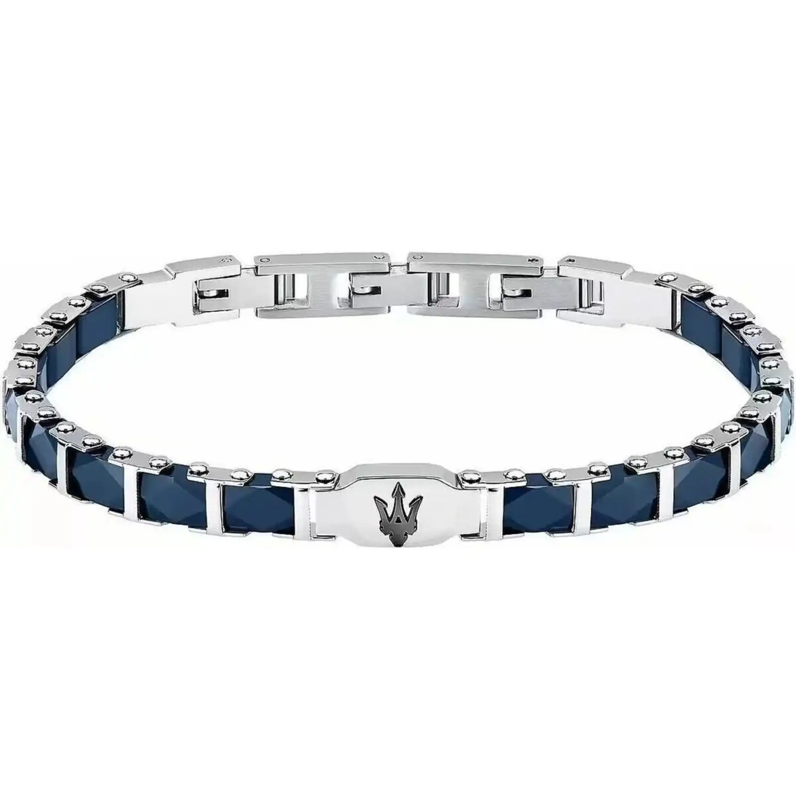 Features: Item: JM424ATZ45 Brand: Maserati Gender: Men’s Colour: Silver And Navy Blue Product Type: Bracelet Material: Steel And Ceramic Size: 18.5cm + 3cm