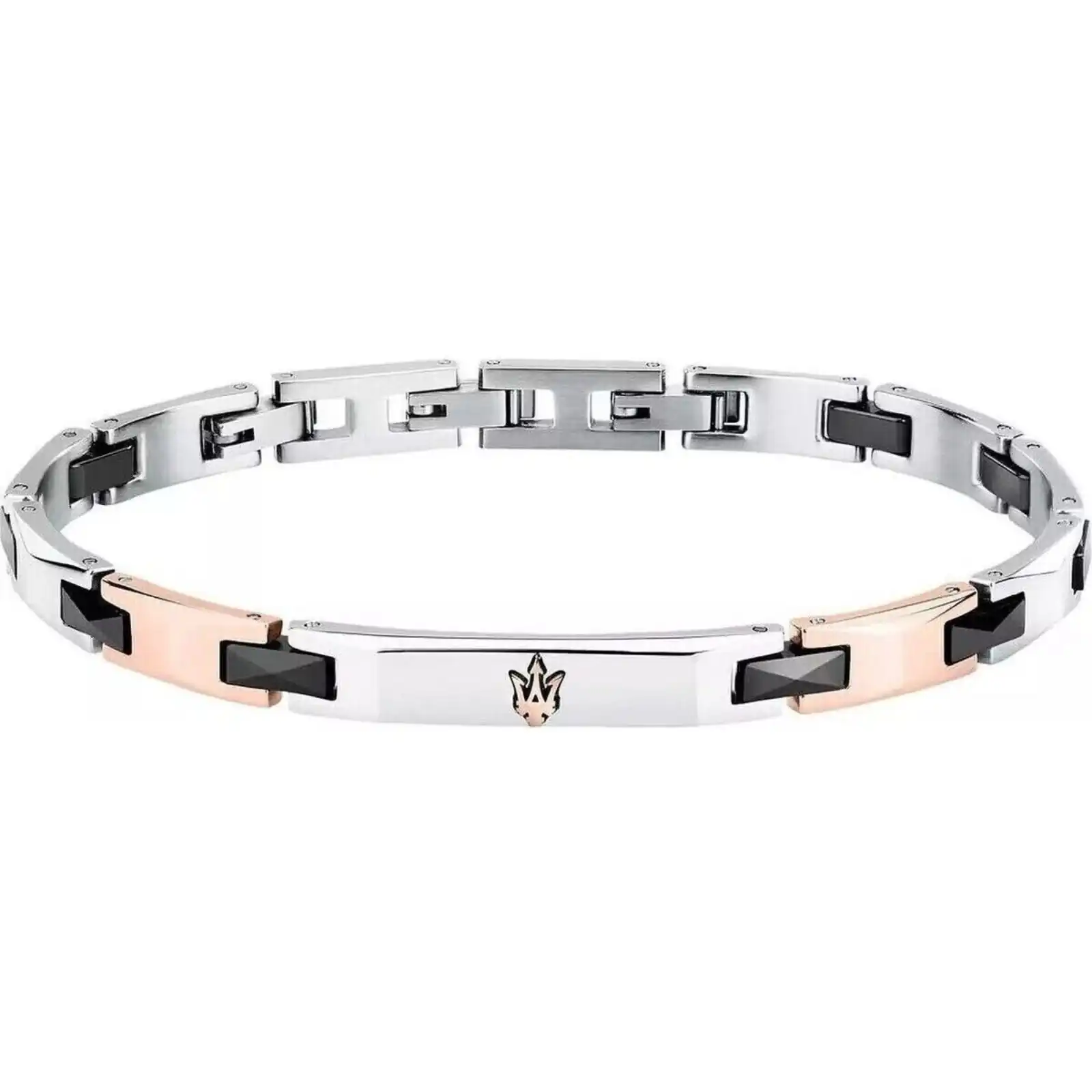 Features: Item: JM424ATZ50 Brand: Maserati Gender: Men’s Colour: Silver, Rose Gold And Black Product Type: Bracelet Material: Steel And Ceramic Size: 18.5cm + 3cm