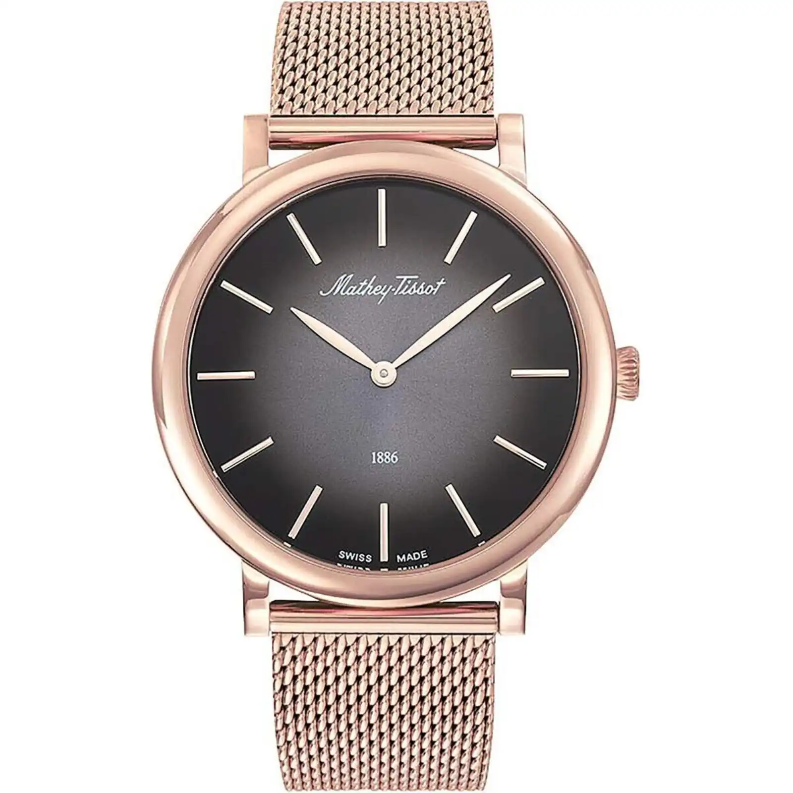 Features: 316L Rose Gold Tone Stainless Steel Case 316L Rose Gold Tone Stainless Steel Mesh Bracelet Swiss Made Quartz Movement Caliber: Ronda 515 Sapphire Crystal Black Dial Analog Display Pull/Push Crown Solid Case Back Deployment Clasp 50M Water Resistance Approximate Case Diameter: 40.00 mm Approximate Case Thickness: 07.00 mm Approximate Lug Width: 20.00 mm