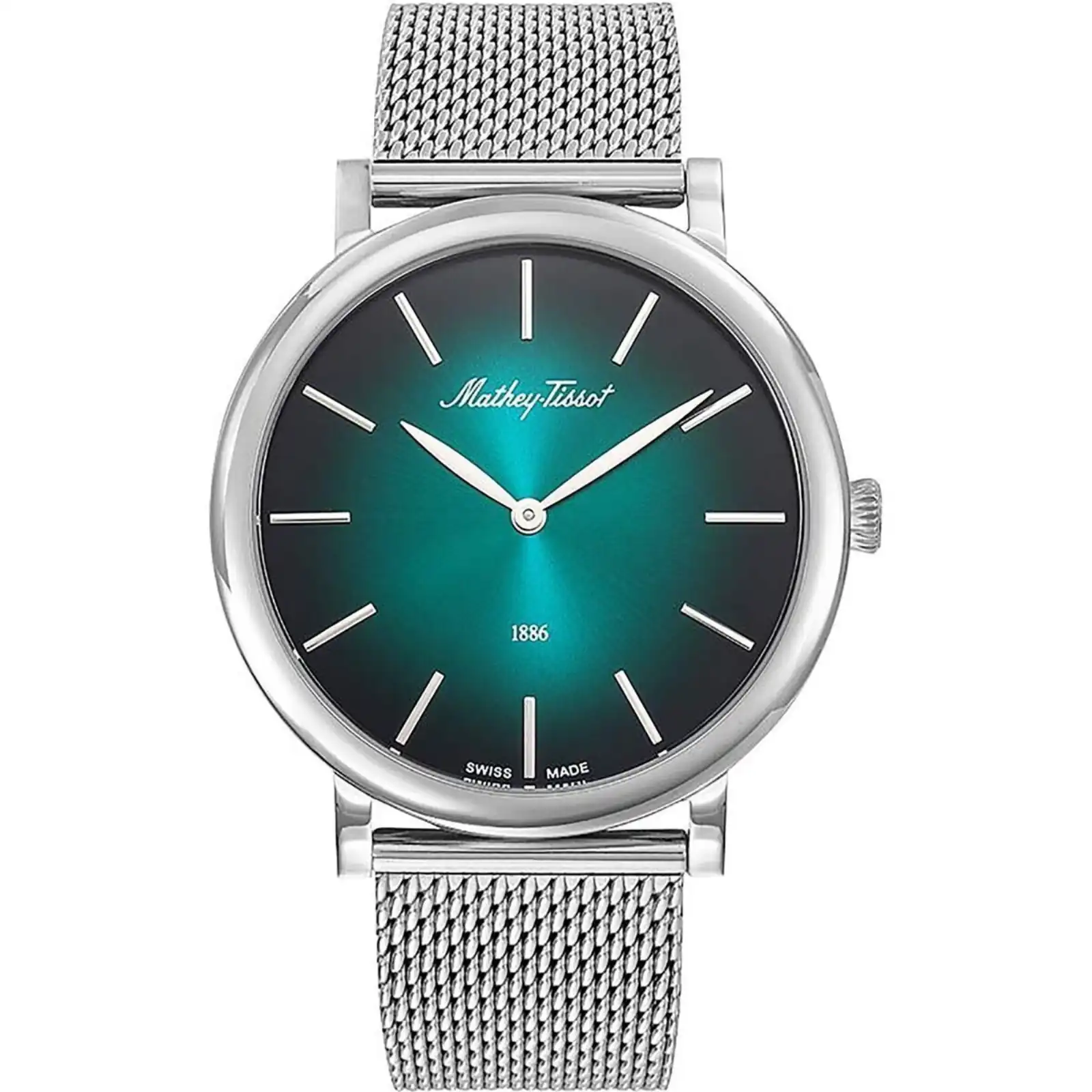 Features: 316L Stainless Steel Case 316L Stainless Steel Mesh Bracelet Swiss Made Quartz Movement Caliber: Ronda 515 Sapphire Crystal Green Dial Analog Display Pull/Push Crown Solid Case Back Deployment Clasp 50M Water Resistance Approximate Case Diameter: 40.00 mm Approximate Case Thickness: 07.00 mm Approximate Lug Width: 20.00 mm