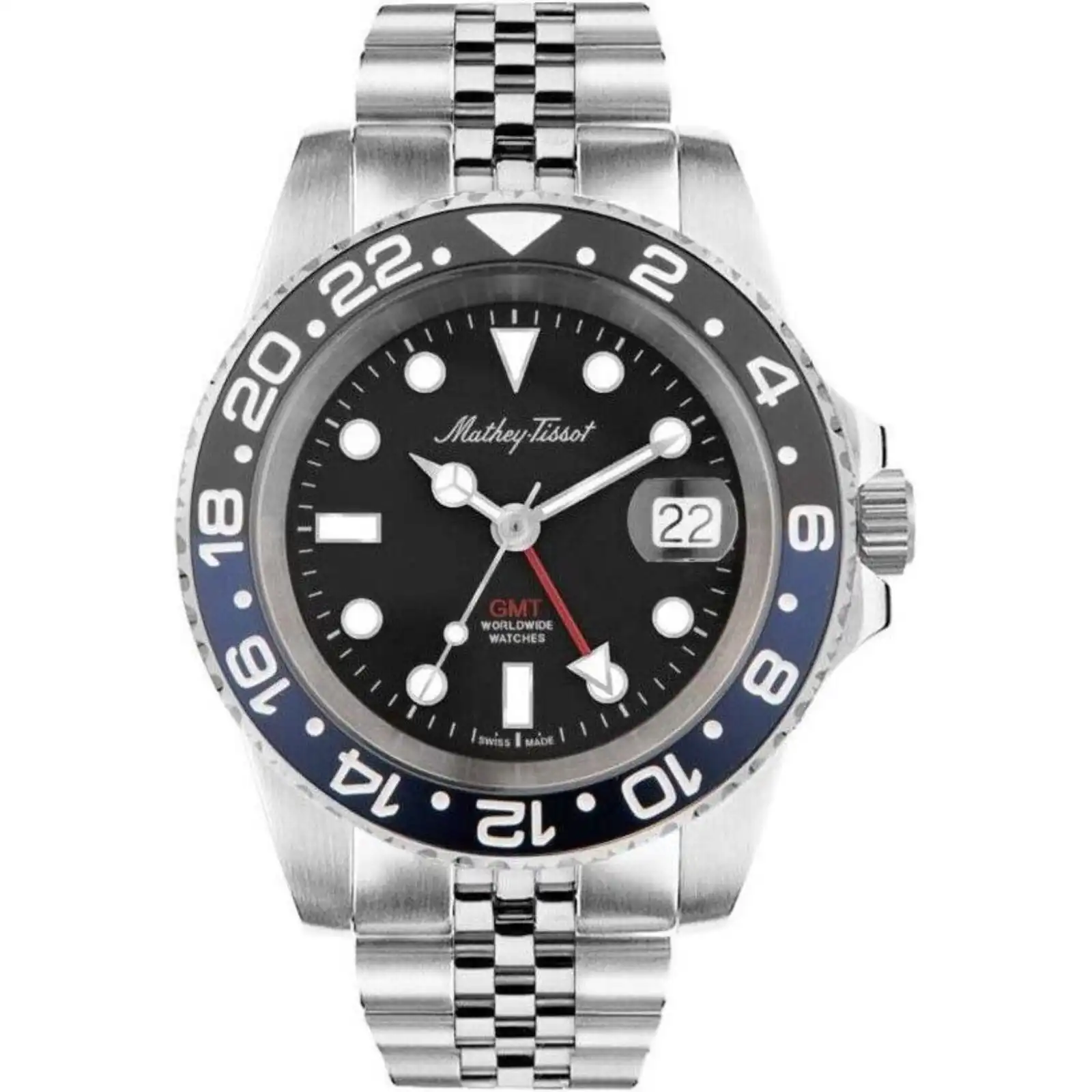 Features: 316L Stainless Steel Case 316L Stainless Steel Bracelet Quartz Movement Caliber: RONDA 515 Sapphire Crystal Black Dial Analog Display GMT Function Luminous Hands And Markers Date Display 12/24 Hours Display Unidirectional Rotating Bezel Screw Down Crown Screwed Case Back Deployment Clasp 100m Water Resistance Approximate Case Diameter: 42mm Approximate Case Thickness: 10mm