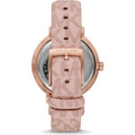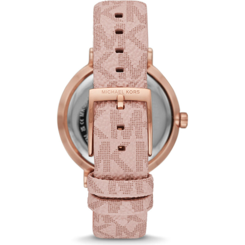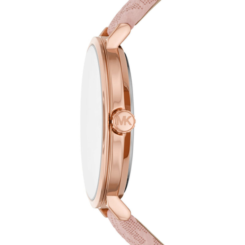 The MK2947 features a radiant White Sunray dial housed within a polished Rose Gold-Tone alloy case. The minimalist dial layout ensures high legibility while the 40mm case provides a modern, “boyfriend-style” silhouette. This radiant hardware is perfectly complemented by the Ballet Pink PVC leather strap, which features the iconic Michael Kors signature logo pattern for immediate brand recognition and a touch of heritage luxury.