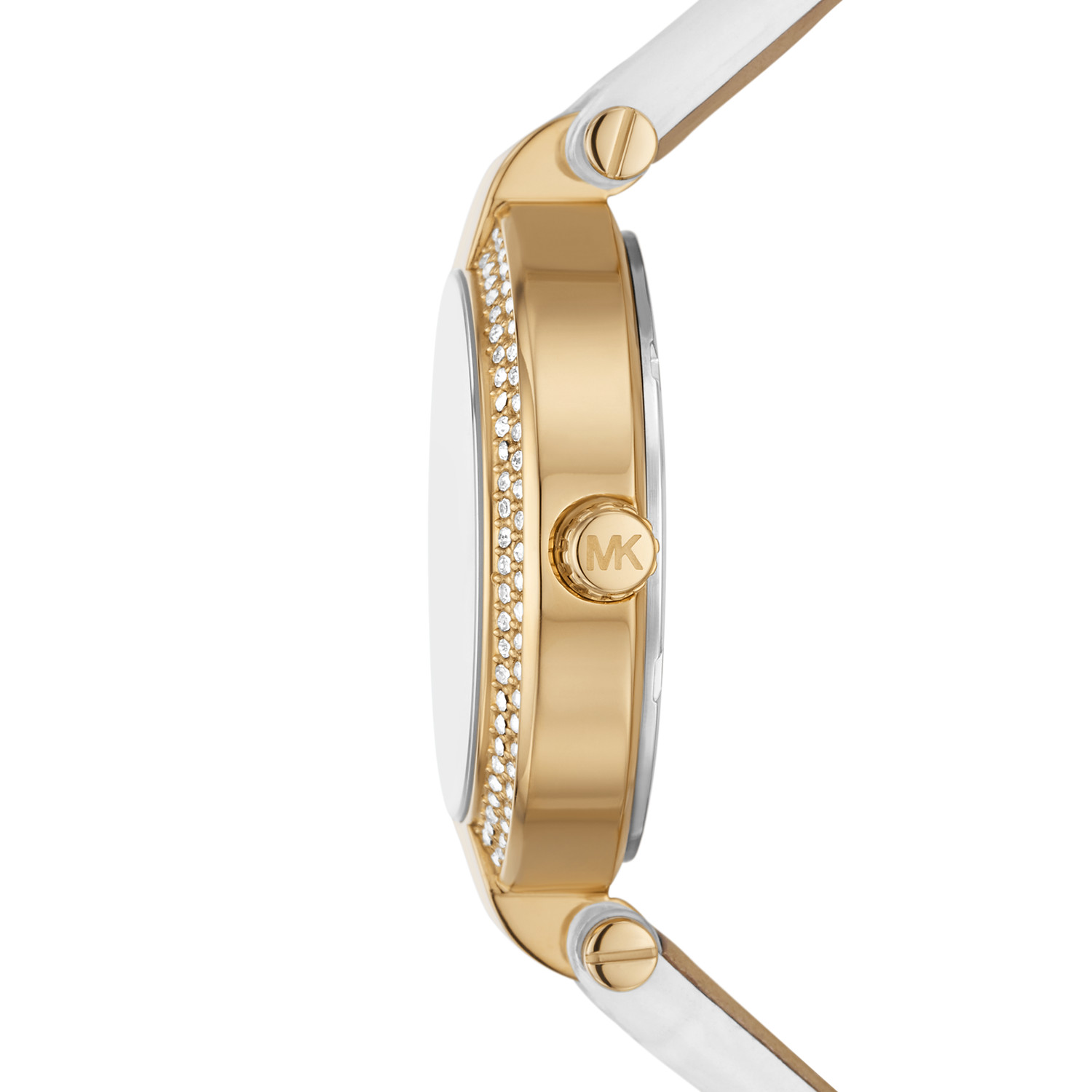 The MK2980 features a pristine White dial housed within a high-polished Yellow Gold-Tone stainless steel case. The dial layout is a sophisticated blend of classic Roman numerals and modern stick indices, creating a balanced and readable face. The standout feature is the Fixed Crystal-Pavé Bezel, which frames the dial with a brilliant halo of light-catching stones, ensuring this timepiece makes a radiant impression from every angle.
