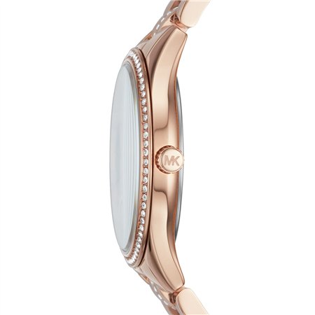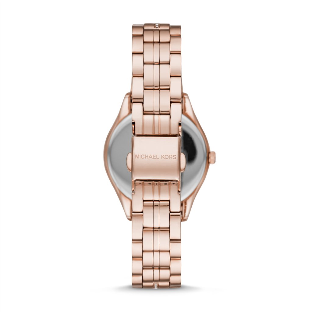 Internally, the MK3716 is powered by a reliable Japanese Quartz 3-hand movement. This caliber is the gold standard for luxury fashion timepieces, offering a level of accuracy that mechanical watches cannot match, typically remaining precise within seconds per month. Because the movement is remarkably compact, Michael Kors was able to maintain the Lauryn’s ultra-slim 7mm case profile—a critical feature for a watch that is often worn stacked with other jewellery. Powered by a long-life silver-oxide battery, it requires minimal maintenance, ensuring that it is always ready for your next event without the need for manual winding. The smooth three-hand motion (hours, minutes, seconds) provides a clean, elegant timekeeping experience.
