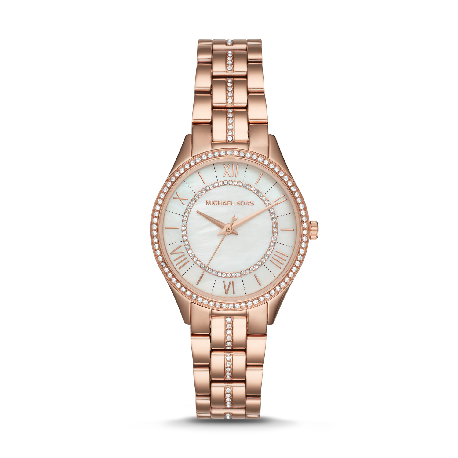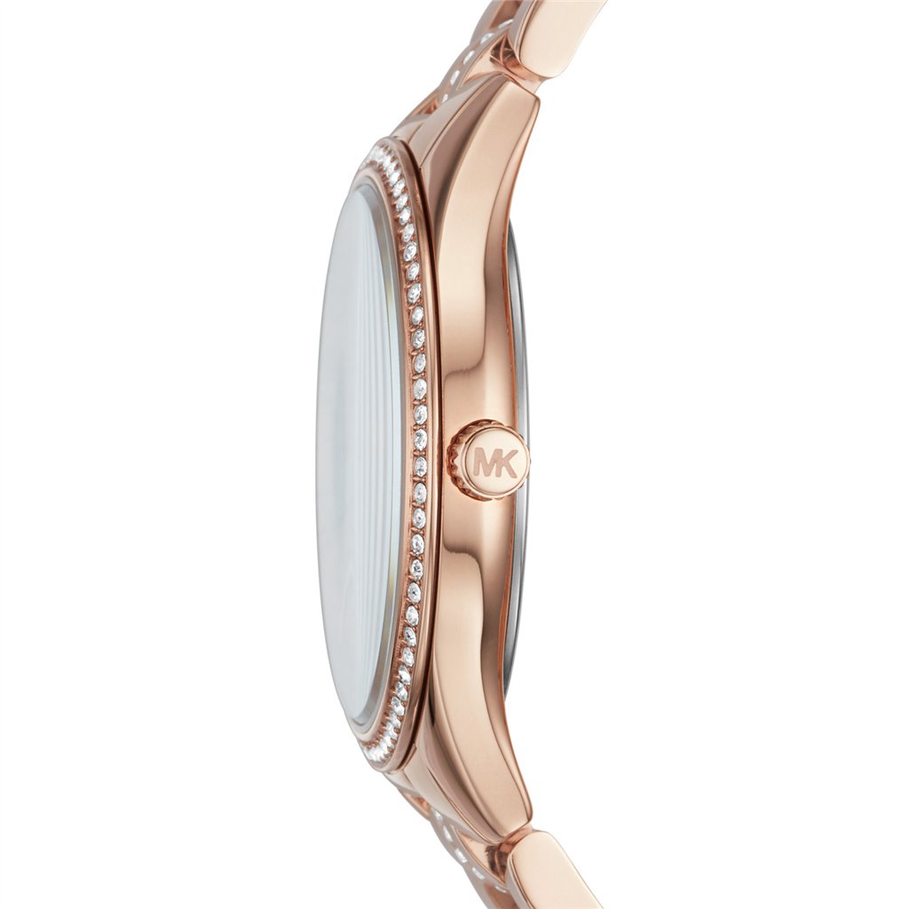 Our visual audit of the MK3716 reveals a complex interplay of natural materials and high-lustre metallics. The case is forged from surgical-grade 316L stainless steel, treated with a rich Rose Gold-Tone Ion Plating (IP) that provides a warm, coppery foundation. The White Mother of Pearl (MOP) Dial offers an organic iridescence, shifting through shades of pink, cream, and silver. This natural shimmer is dramatically framed by a Pavé Crystal Inner-Ring, creating a “halo” effect within the dial itself. Classic rose gold-tone Roman numerals and slender hands provide a traditional counterpoint to the modern glitz. However, the most striking feature is the Glitz Center-Link Bracelet. While the outer links are high-polished rose gold, the entire centre row is hand-set with clear crystals, ensuring that the watch sparkles even when viewed from the side or the back of the wrist.