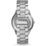 Our visual audit of the MK3178 confirms a pure, monochromatic aesthetic designed for timelessness. The entire timepiece is rendered in high-grade Silver-Tone stainless steel, providing a cool, versatile metallic finish. The Silver Sunray dial is the centerpiece of the design; it features a radial brushing that catches and redirects light, giving the dial a dynamic, liquid-like appearance. The minimalist layout eschews numerals in favour of polished silver-tone Baton Indices and sleek sword hands. This clean, “uncluttered” face ensures that the focus remains on the quality of the materials and the elegance of the scale. The watch is framed by a stationary, polished bezel that blends seamlessly into the integrated lugs, creating a unified, sculptural look.