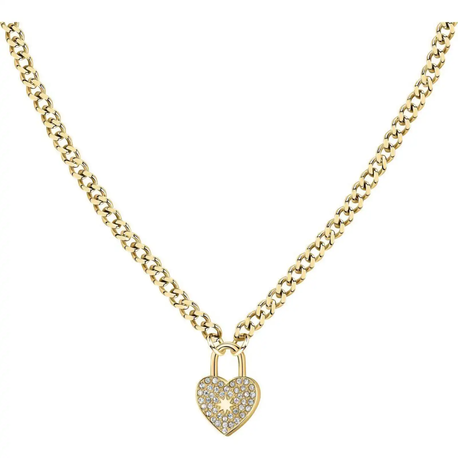Features: Item: SABG25 Collection: Abbraccio Size: 40cm, 5cm Colour: Gold Tone Product Type: Necklace Closure Type: Lobster Clasp Stone: Crystals Symbol: Heart Material: Stainless Steel Weight: 25g