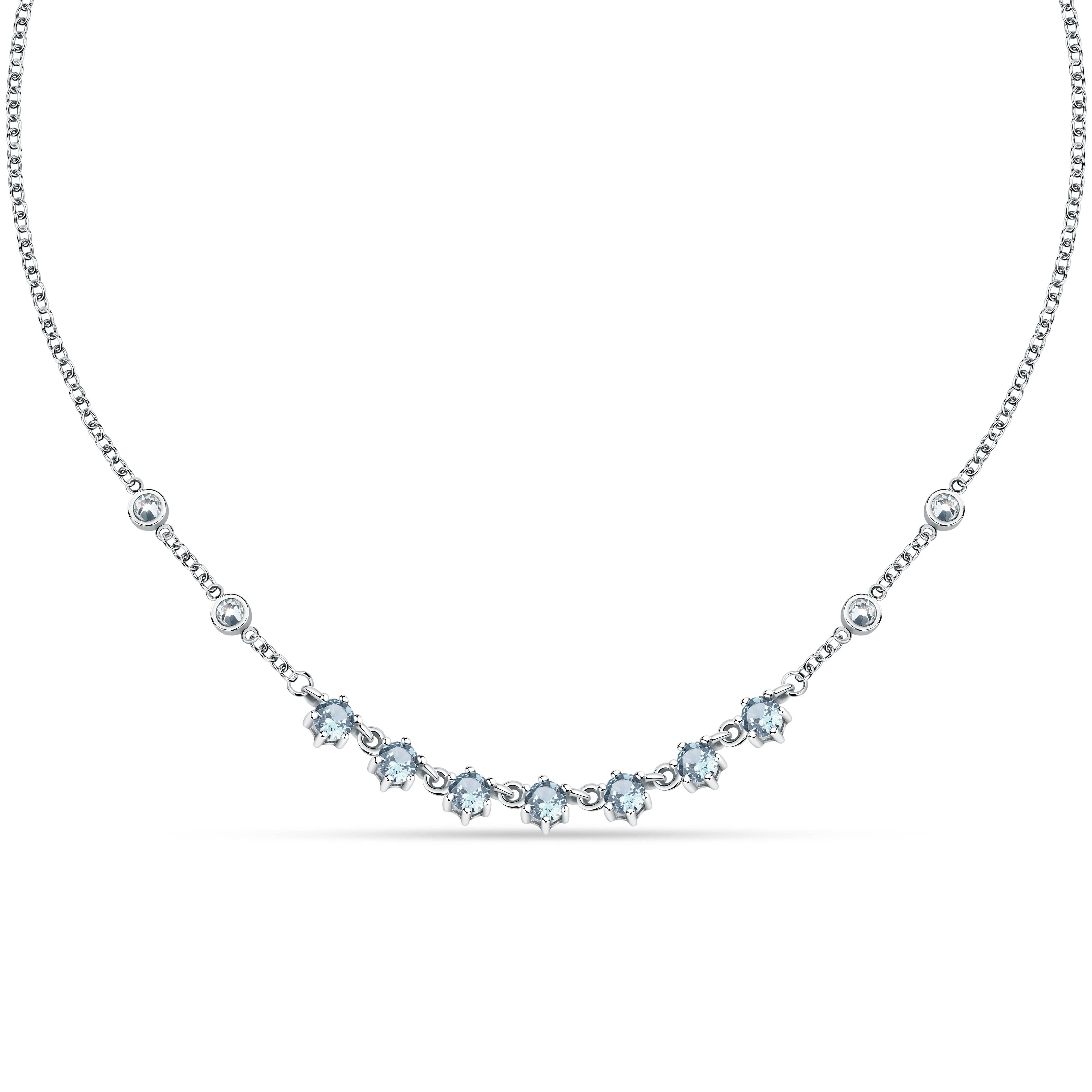 Features: Item: SAVY14 Collection: Colori Size: 36cm, 9cm Colour: Silver Product Type: Necklace Closure Type: Lobster Clasp Stone: Light Blue Crystals Material: Stainless Steel Weight: 7g