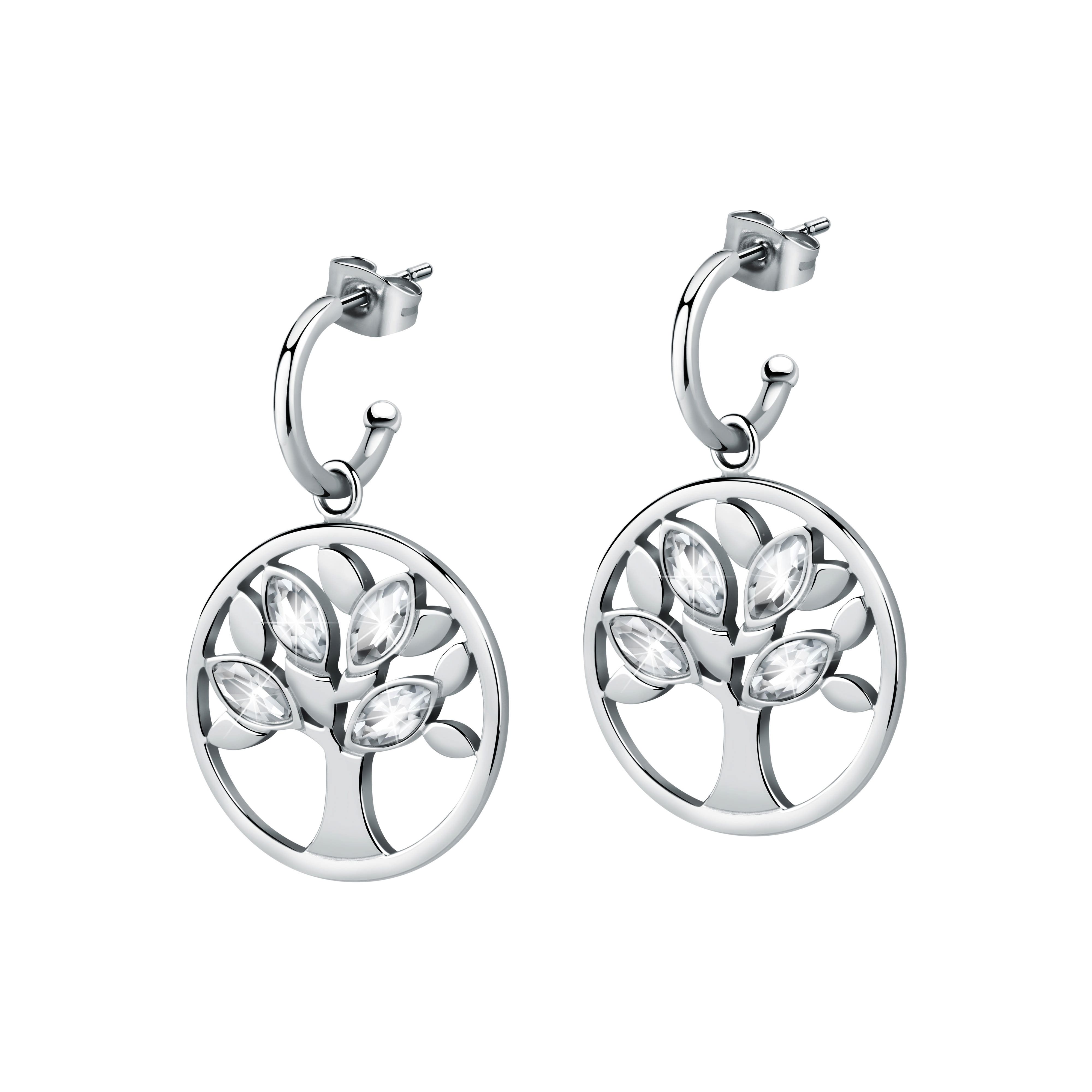 Features: Item: SATD18 Collection: Vita Size: 36.2mm Colour: Silver Product Type: Earrings Closure Type: Push Back Clasp Stones: Zircons Symbol: Tree Of Life Pendant Material: Stainless Steel
