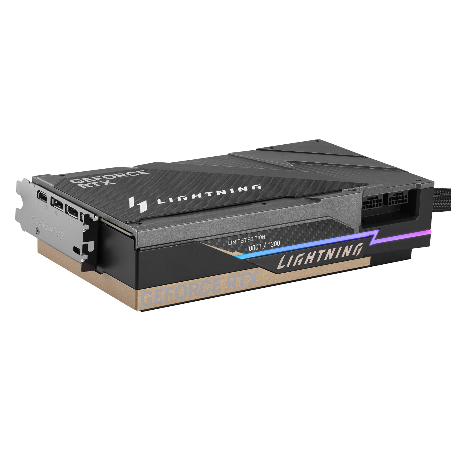 The LIGHTNING fan, specifically designed for this series, employs aerodynamic blades that optimise airflow and static pressure, ensuring maximum cooling efficiency without excessive noise. Complementing this is the exclusive LIGHTNING HUB & OVERDRIVE APP, a web-based hub and mobile application that grants you seamless control over your GPU’s performance, the integrated display, and all RGB lighting effects. Built with a rigid carbon fiber backplate featuring the signature Lightning Pattern, it delivers not only structural integrity but also a distinct technical elegance. With PCI Express Gen 5 support, a 512-bit memory bus, and 32GB of GDDR7 memory, this card is ready for the most demanding applications and games, offering a digital resolution up to 7680 x 4320 for unparalleled visual clarity.