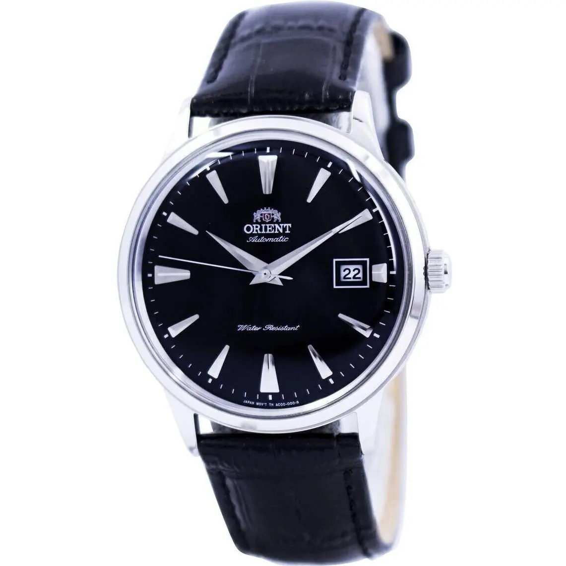 Orient Bambino Series Stainless Steel Case Black Leather Strap Caliber: F6724 Automatic Self-Winding Movement Domed Mineral Crystal Black Dial 40 Hours Power Reserve Date Indicator Screw Caseback Buckle Clasp 30M Water Resistant